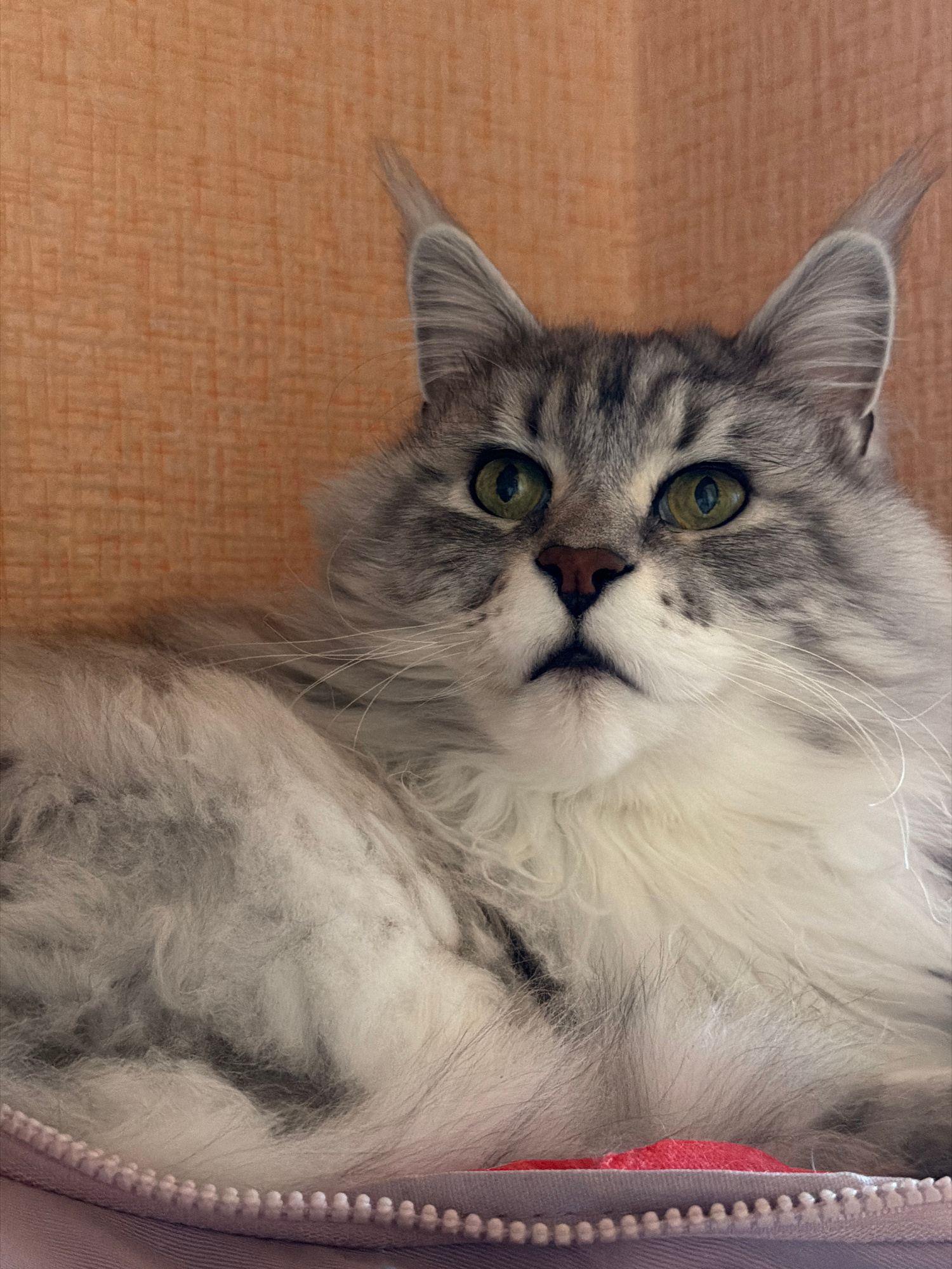 A close-up shot of a grey and white Maine Coon cat lying on its side with its head tilted towards the camera. The cat has green eyes and a pink nose, and its fur is long and fluffy. The background is…read more
