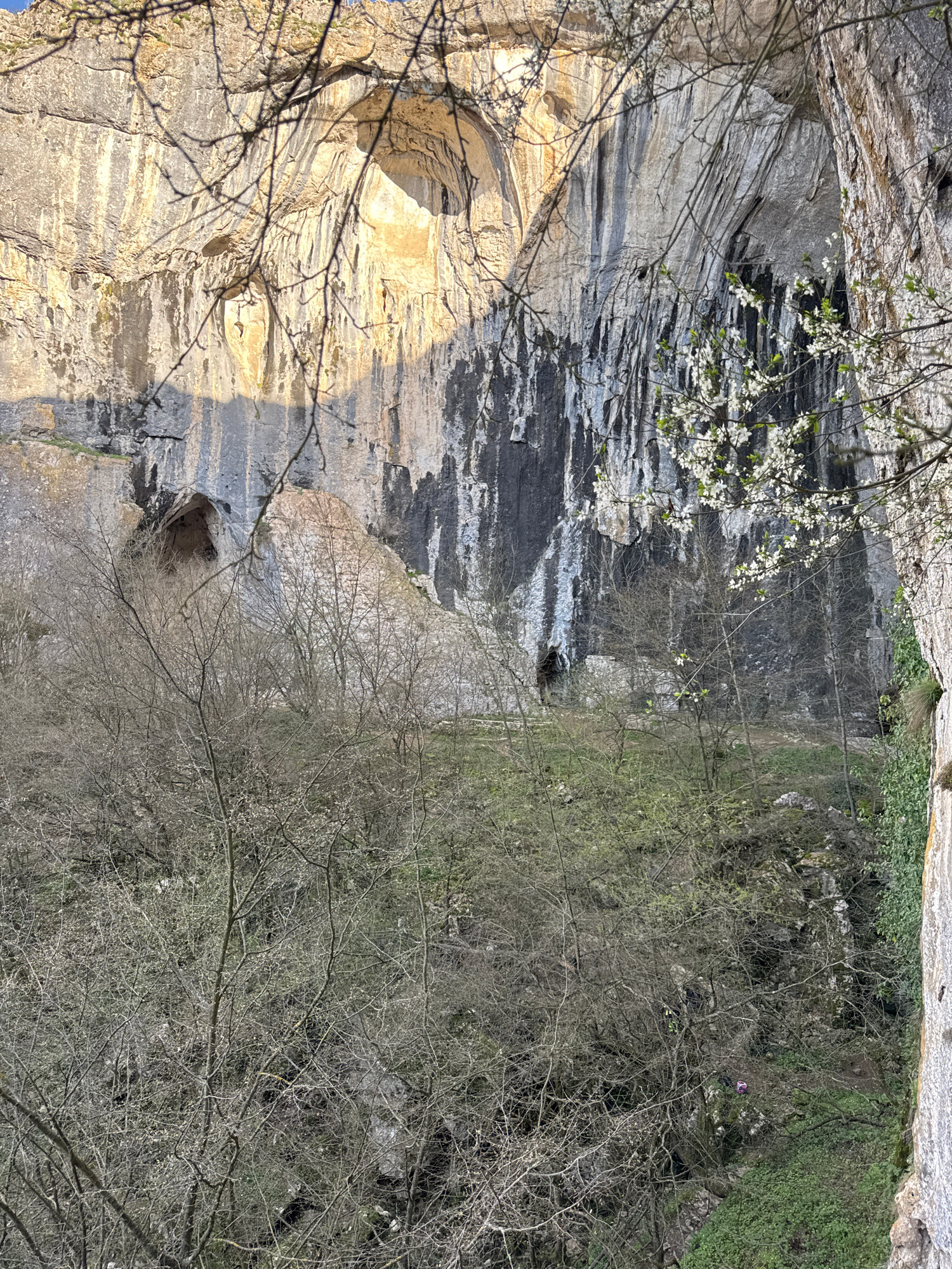The image shows a limestone cliff face with visible layering and erosion features, possibly located near Karlukovo, Bulgaria, based on the limestone formations typical of that region. The cliff has ar…read more