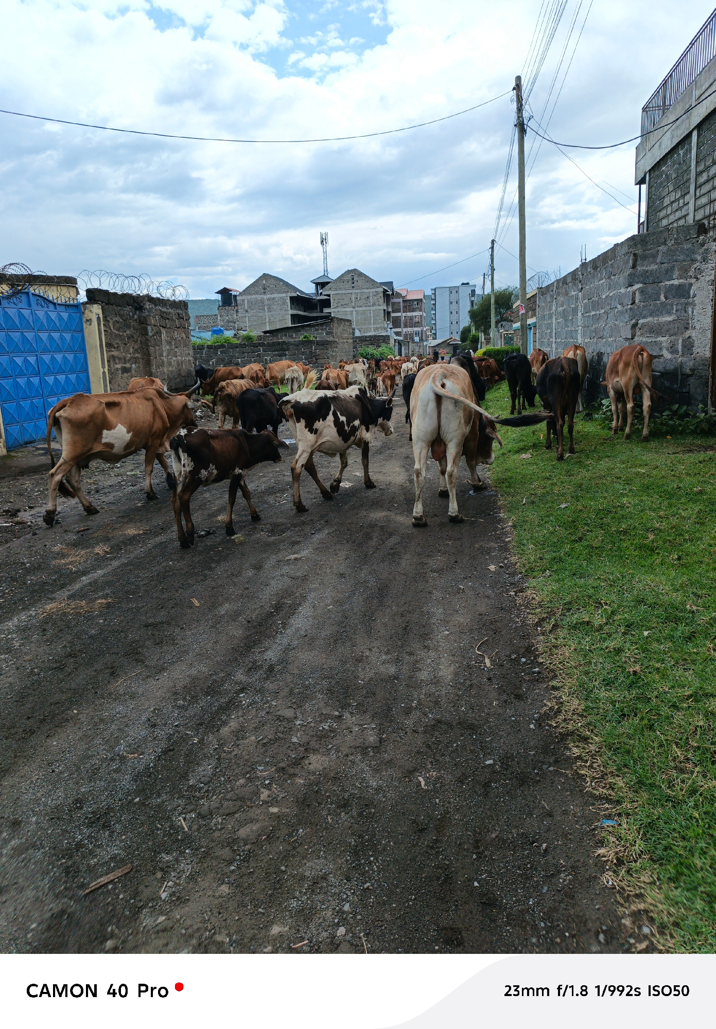 The image captures a herd of cattle moving along a dirt road in an urban setting, likely in Nakuru, Kenya. The road is flanked by low stone walls topped with barbed wire, a blue metal gate, and patche…read more