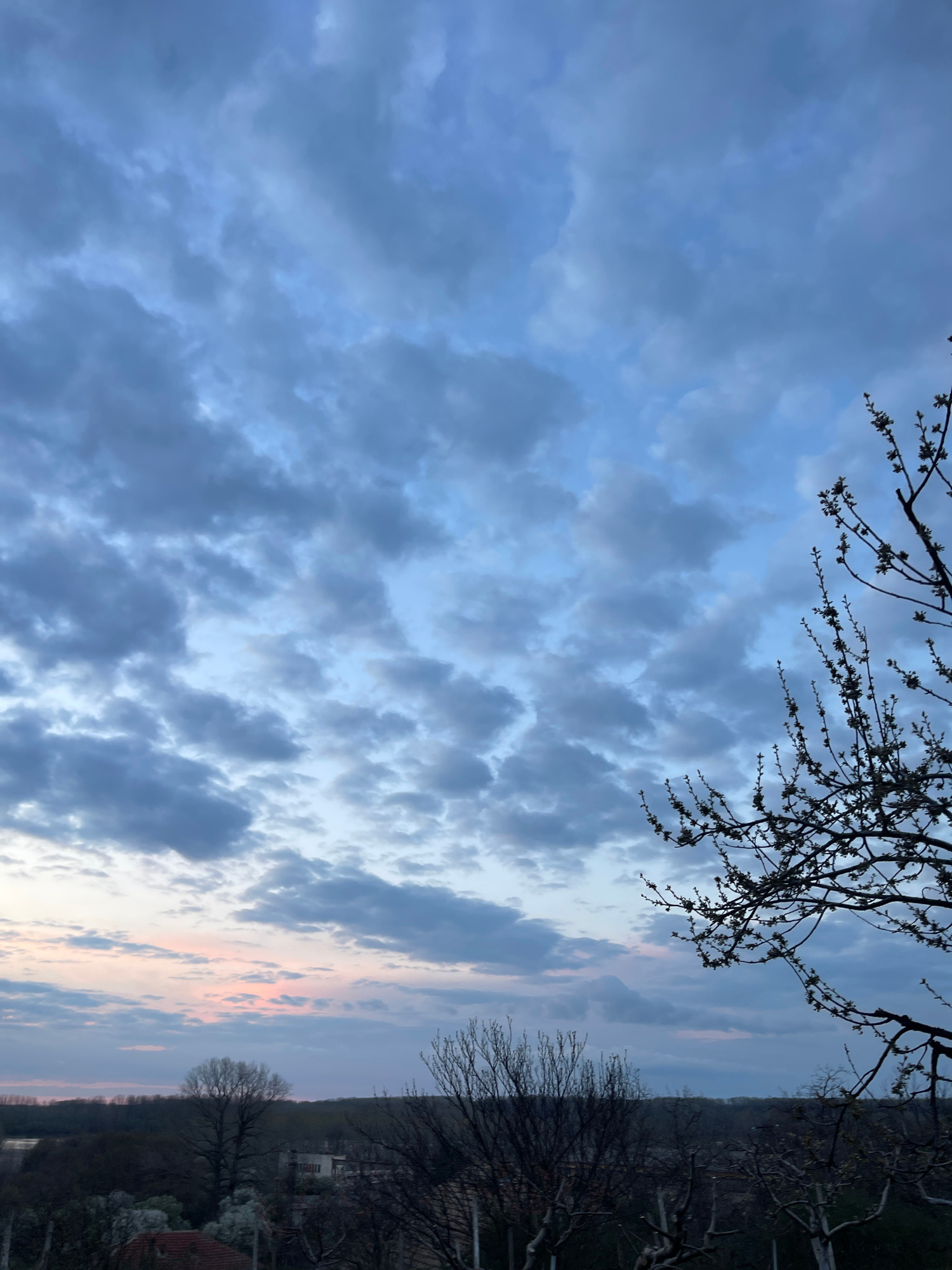 The image captures a twilight scene, with a predominantly cloudy sky taking up most of the frame. The clouds are various shades of gray and blue, with a hint of pink and orange near the horizon, sugge…read more