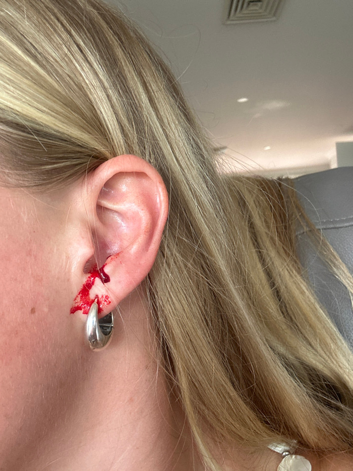 A close-up photograph shows a woman's earlobe torn and bleeding. A large, silver, crescent-shaped earring is visible in the torn lobe. Blood is dripping down the side of her ear and onto her neck. Her…read more