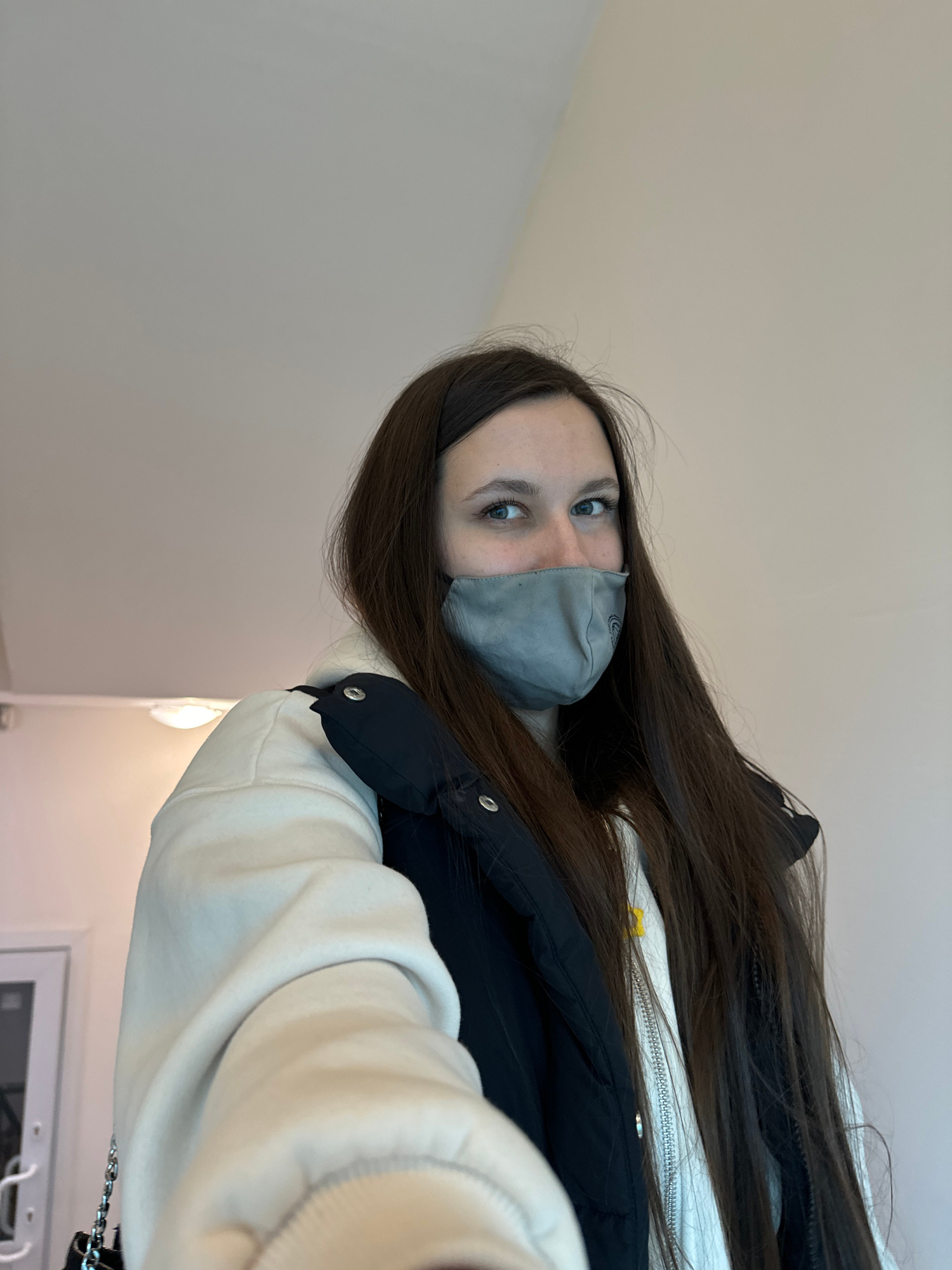 The image is a close-up portrait of a young person, depicted as if looking upwards towards the camera in an indoor setting. The subject has long, dark brown hair flowing around their shoulders and che…read more