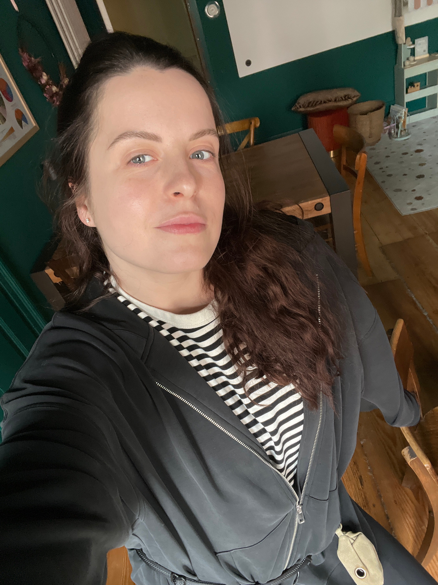 A selfie of a fair-skinned person with blue eyes, wearing a black zip-up jacket over a striped shirt. The background includes a dark green wall, wooden furniture, and part of a patterned floor. The lo…read more