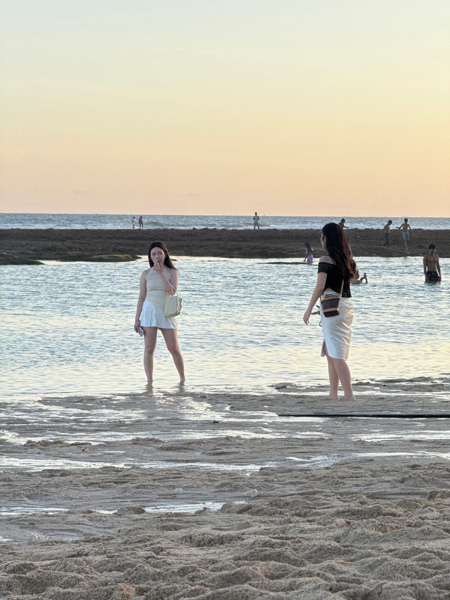 Two women stand in shallow water at the edge of a beach in Kuta Selatan, Indonesia. The woman closest to the camera wears a light-colored dress and carries a purse, while the other woman is dressed in…read more