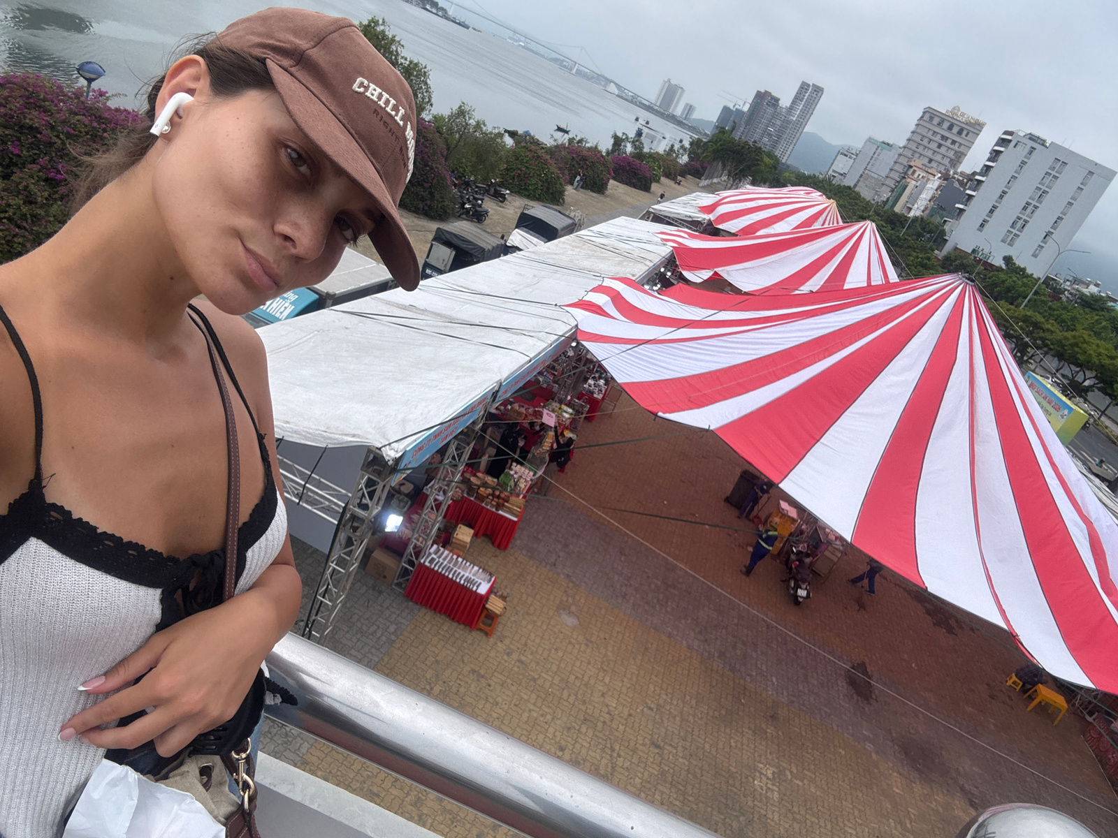 The image is taken from an elevated position in Đà Nẵng, Vietnam, overlooking a market area with red and white striped tents. The cityscape, including buildings and a bridge, is visible in the backgro…read more
