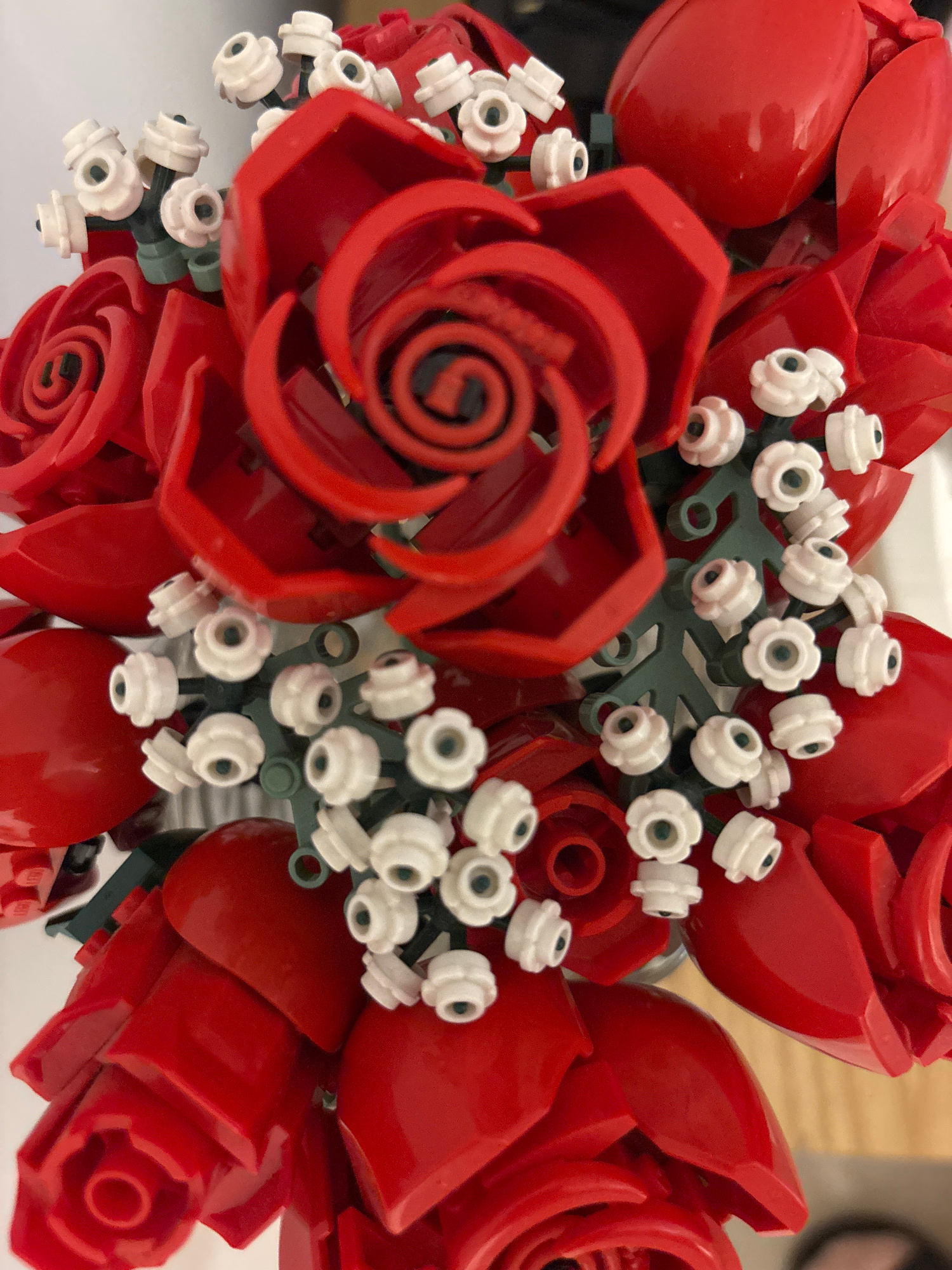 The image shows a bouquet of Lego flowers, primarily red roses with some white floral accents on green stems. The roses are constructed from red Lego pieces, forming the petal shapes. The white flower…read more