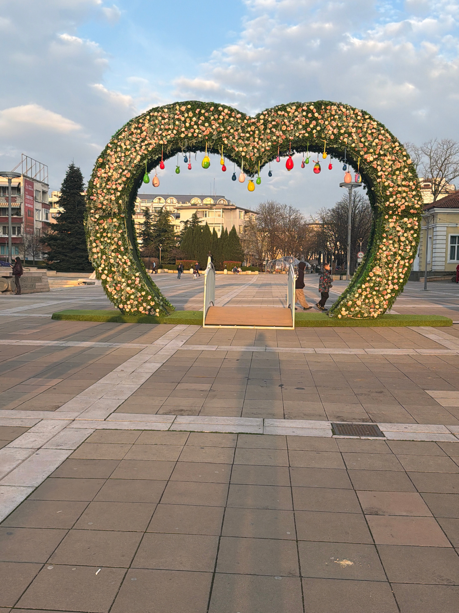 The image captures a scene in the city of Yambol, Bulgaria. The central focus is a large, figure-eight-shaped floral installation decorated with pink and green flowers, with colorful balloons attached…read more