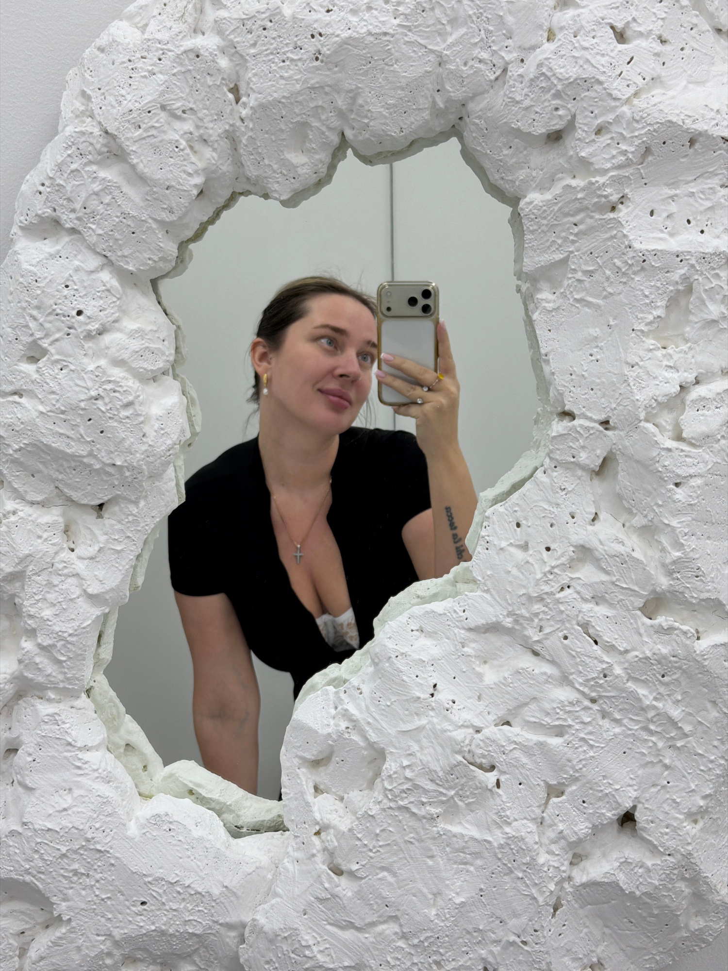 A selfie of a woman is reflected in a white, irregularly-shaped mirror. The woman is holding a smartphone, and wearing a black top, and a cross necklace. There are tattoos on her arm. The wall behind…read more
