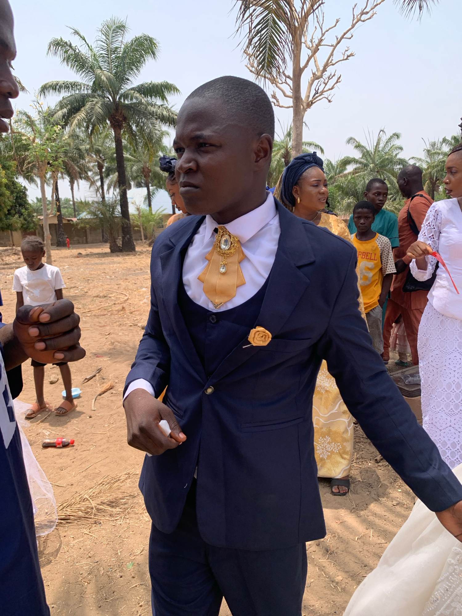 The scene depicts an outdoor gathering in the city of Washo, Nigeria, under bright daylight conditions. A young adult male, of dark complexion and short dark hair, is positioned slightly right of cent…read more