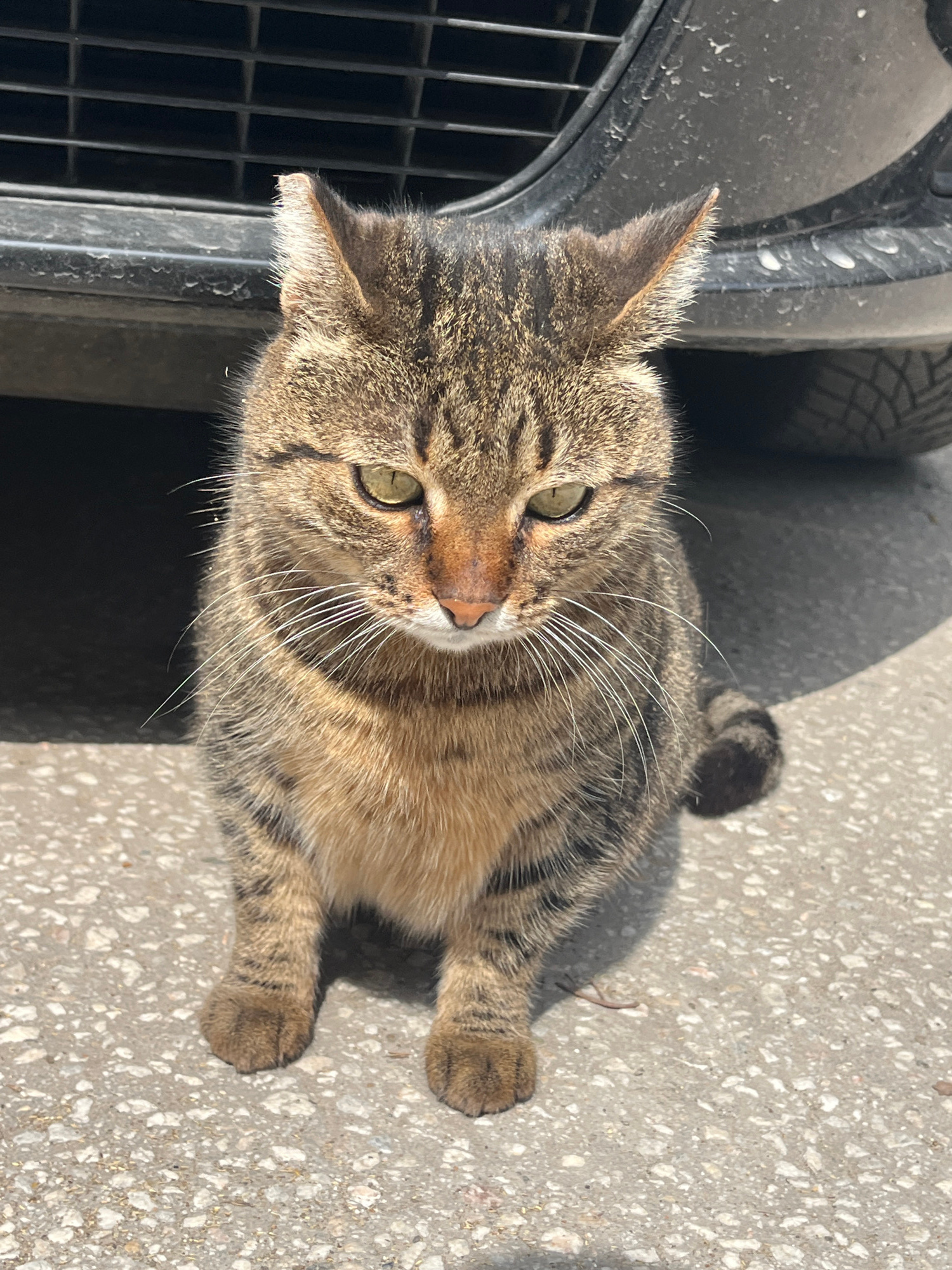 A cat is lying on the ground in Plovdiv, Bulgaria, next to a dark, possibly black, vehicle with a tire partially visible. The cat is a tabby, with gray, brown, and black stripes. It has green eyes andβ¦read more