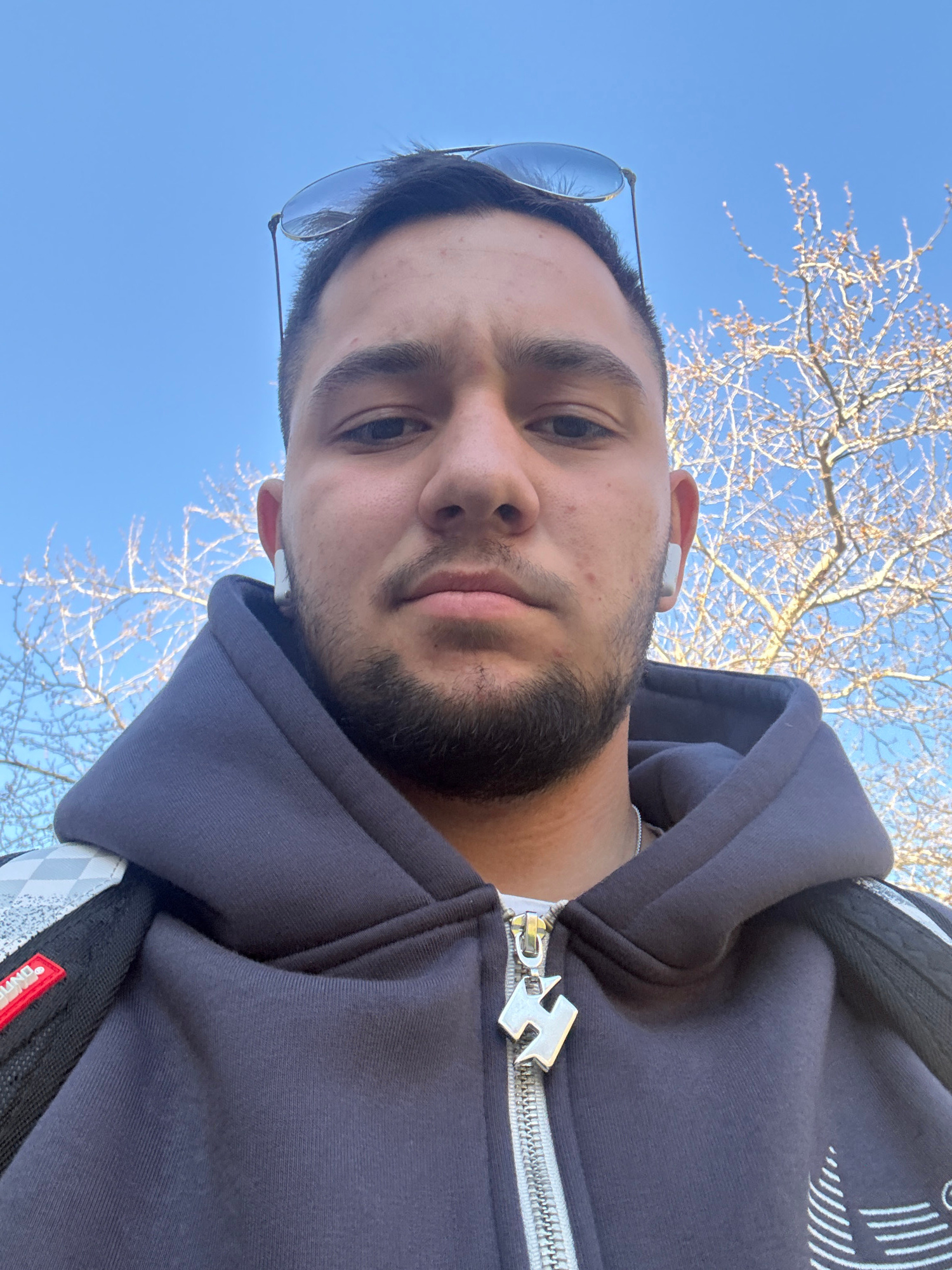 A man is standing outdoors on a sunny day. He is wearing a navy blue hooded sweatshirt, sunglasses on his head, and white wireless earbuds. Part of a tree with bare branches is visible in the backgrou…read more