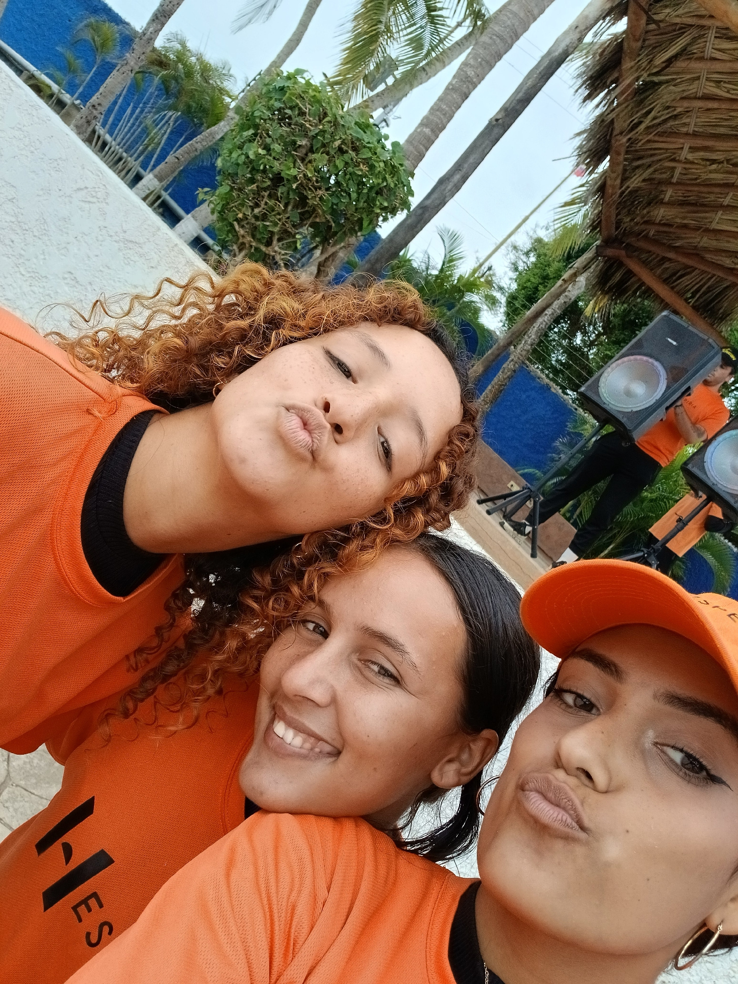 Three women are posing for a selfie, wearing orange shirts and a cap, potentially uniforms. The backdrop reveals elements of Playa El Agua, Venezuela, including palm trees, a blue wall, a thatched roo…read more