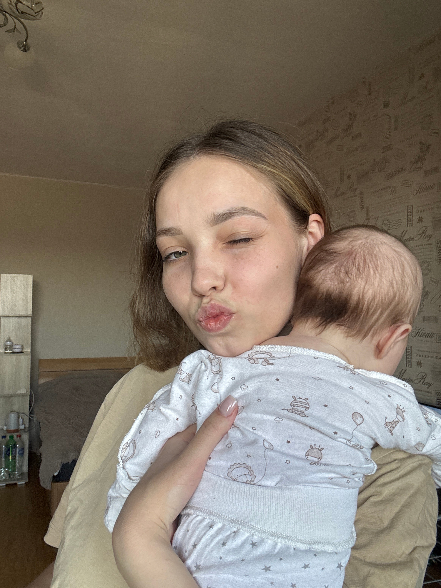 A person with shoulder-length brown hair is holding a baby. The baby is wearing a white outfit with animal prints. The person is making a kissing face toward the camera. The scene is indoors. Undernea…read more