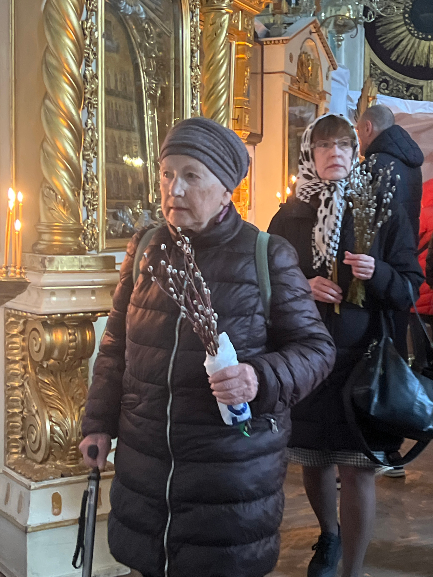 A photograph depicts an elderly woman in a dark brown puffy coat and a dark gray beanie holding willow branches with white buds. She is holding a white plastic bag in her left hand and a black cane in…read more