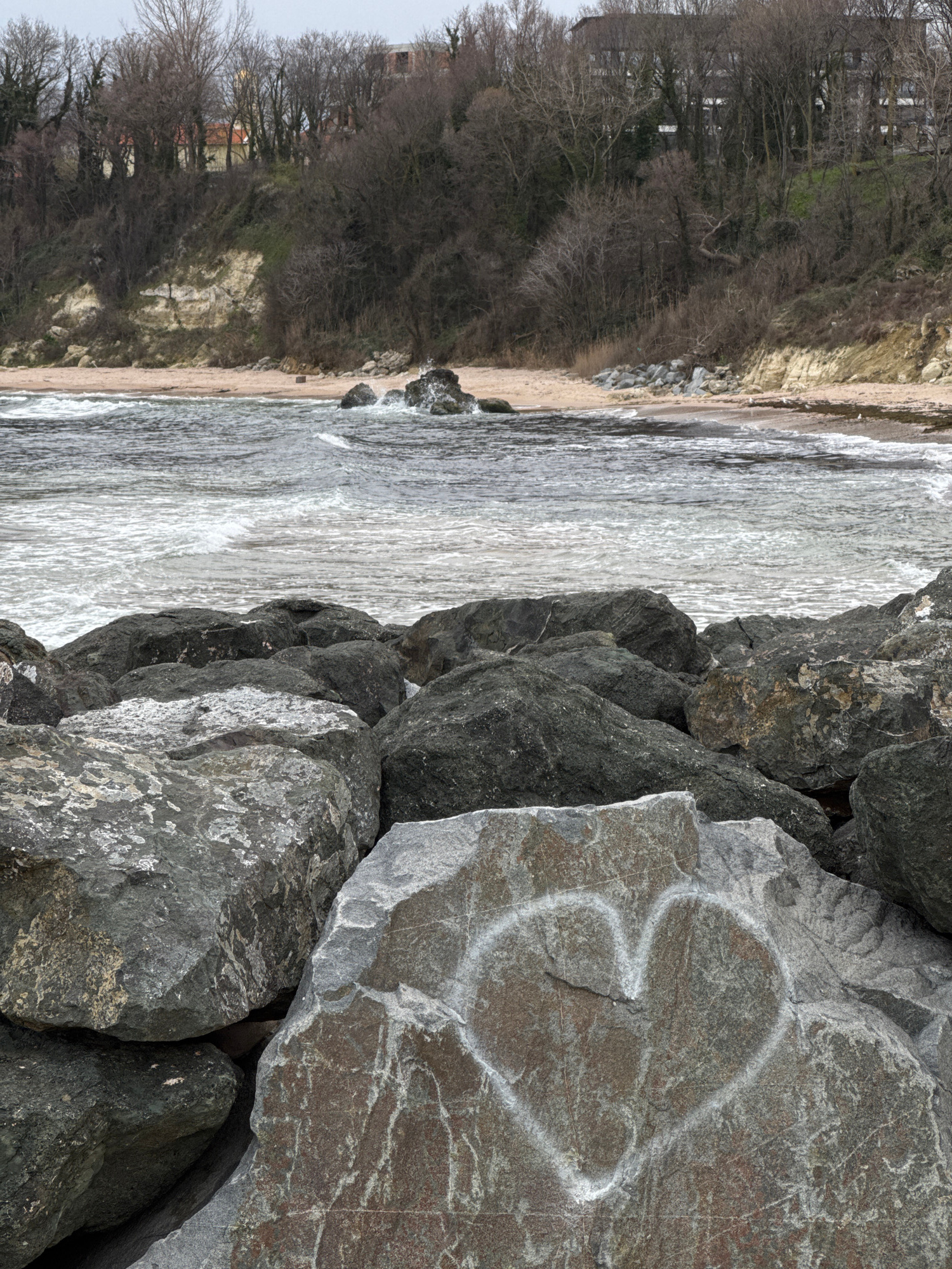 The image shows a rocky coastline. Large, gray rocks with a white heart drawn on one are in the foreground. The sea is visible behind the rocks, with waves breaking on a sandy beach. A tree-lined clif…read more
