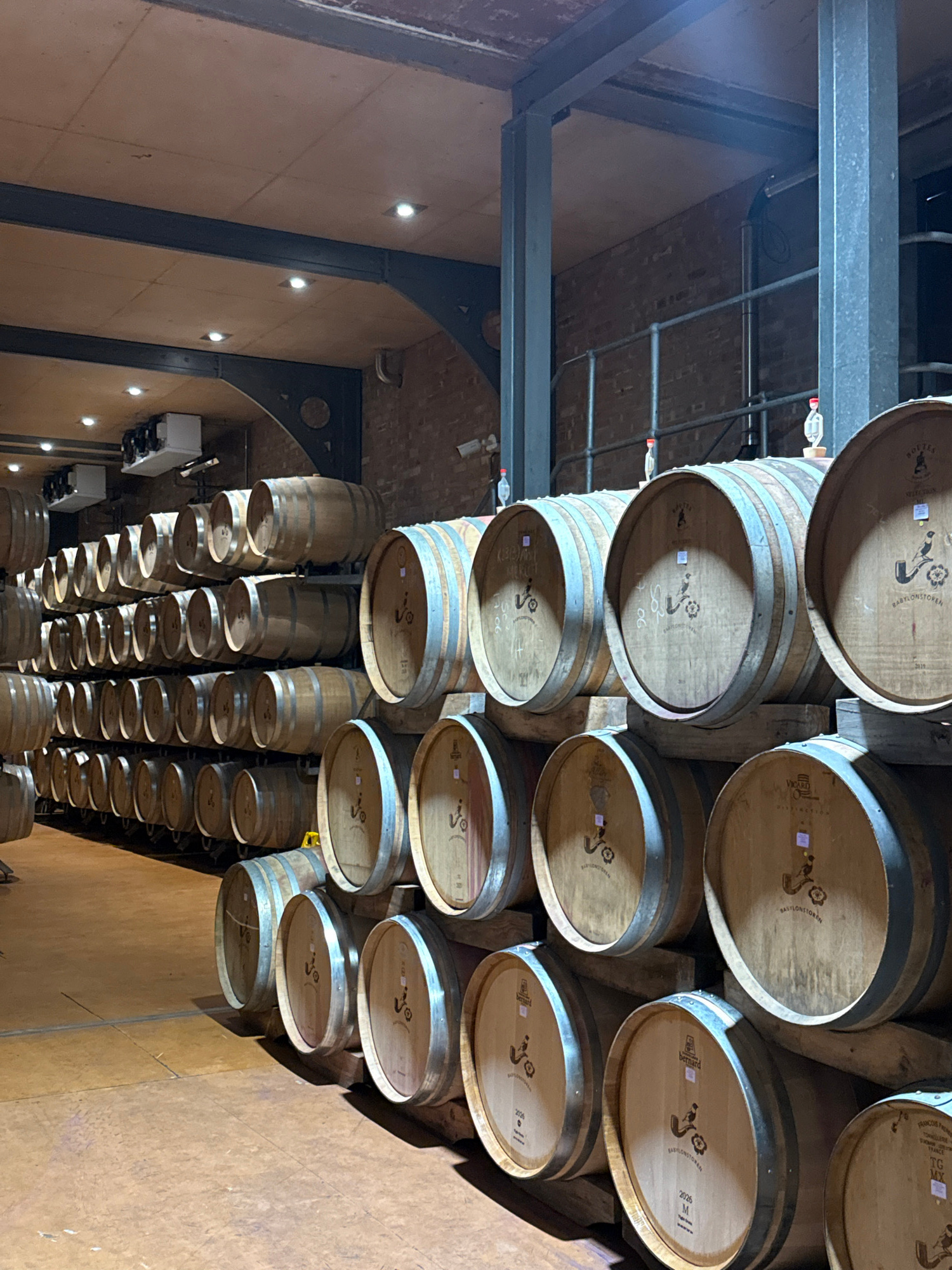 This image captures the interior of a wine cellar, showcasing numerous wooden wine barrels meticulously stacked and stored. The perspective is tilted, looking upwards towards the ceiling where many ba…read more