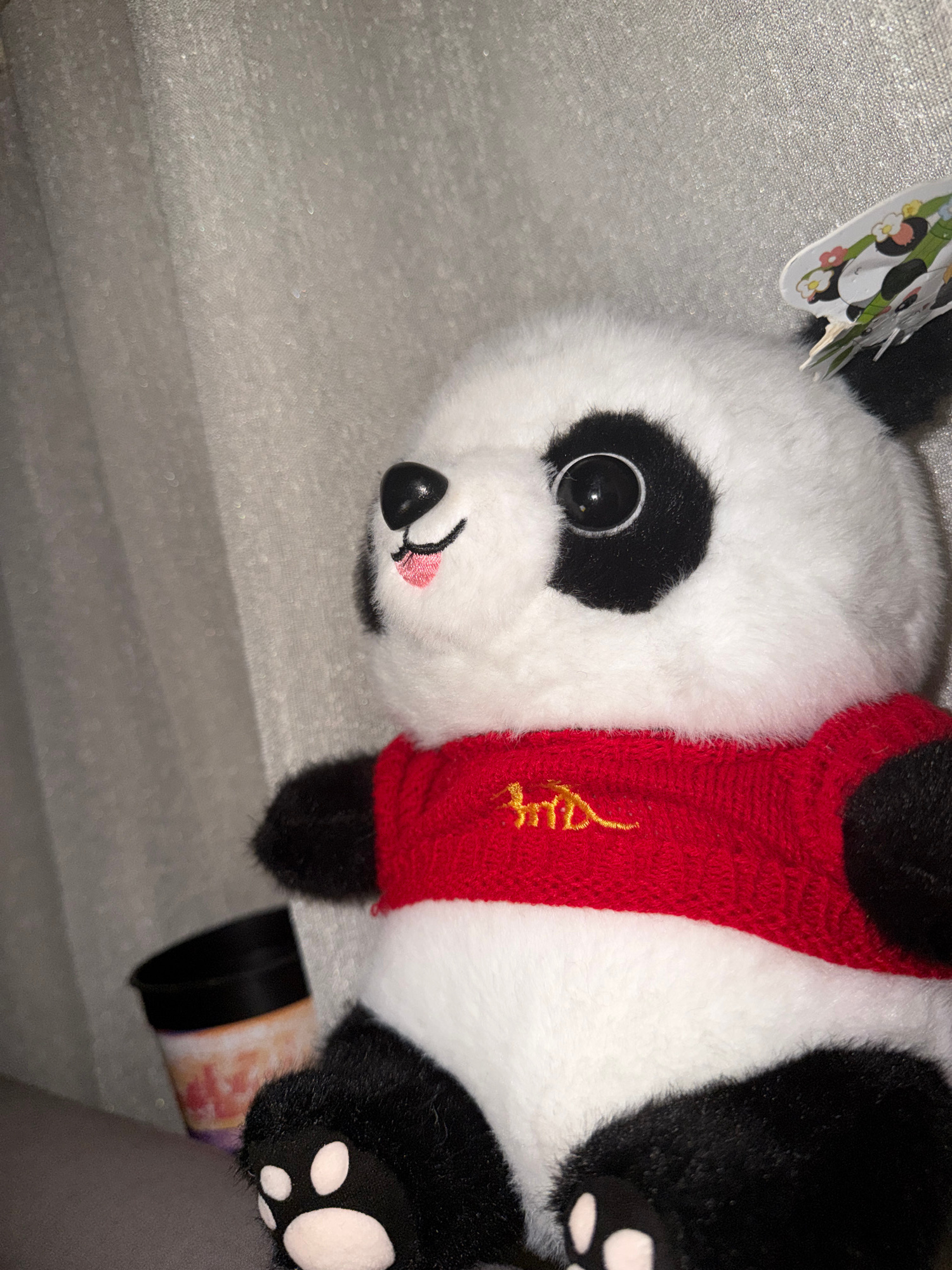 A stuffed panda toy wearing a red knitted scarf lies on a textured gray surface. The panda's head is angled towards the left, revealing a black eye patch, a black nose, and a pink mouth. A black and w…read more