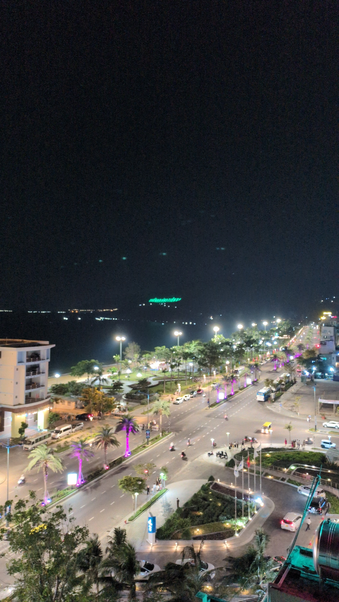 An aerial, nighttime photograph depicts a coastal road in South Quy Nhon Ward, Vietnam, running parallel to a body of water. The scene is illuminated by numerous streetlights and building lights. Theβ¦read more