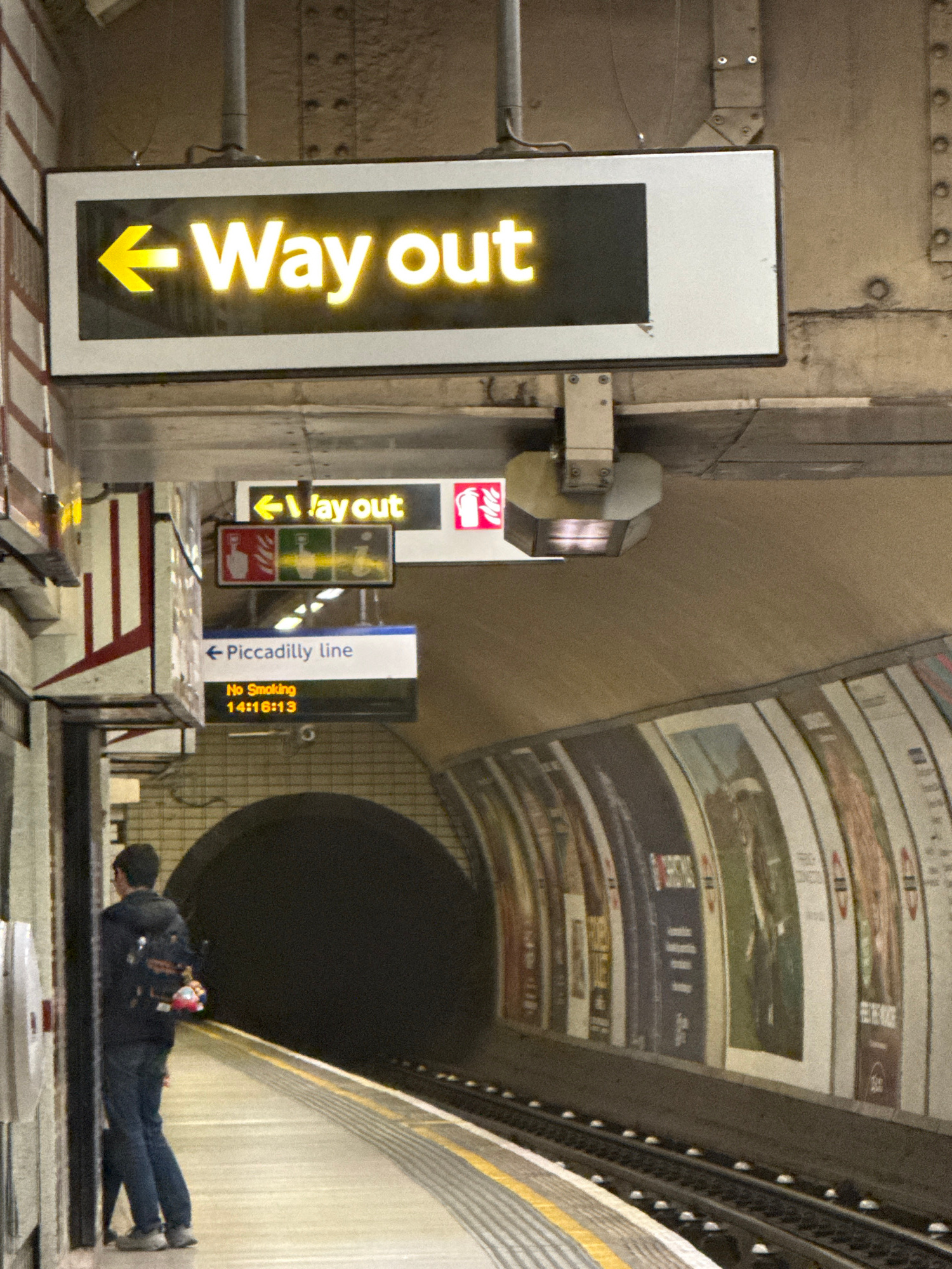 The image depicts a scene within a London Underground station. A man is lying prone on a platform, facing towards the tunnel. He is wearing dark clothing and a hat. To the left are several signs, incl…read more