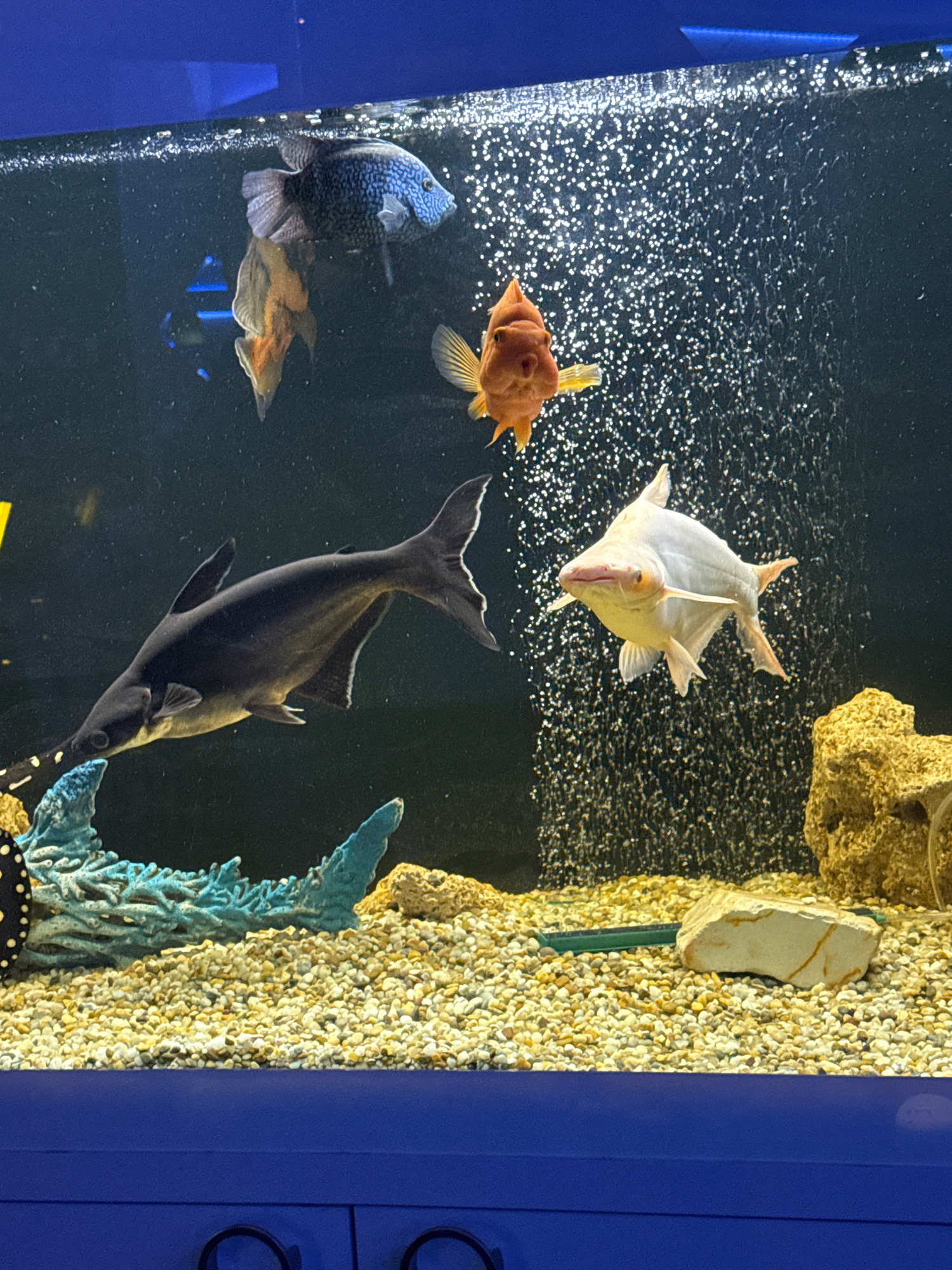 The image shows an aquarium with several fish. There is a white iridescent shark, an orange Oranda goldfish, an iridescent shark catfish, a spotted Raphael catfish, and a mottled blue fish. The aquariβ¦read more