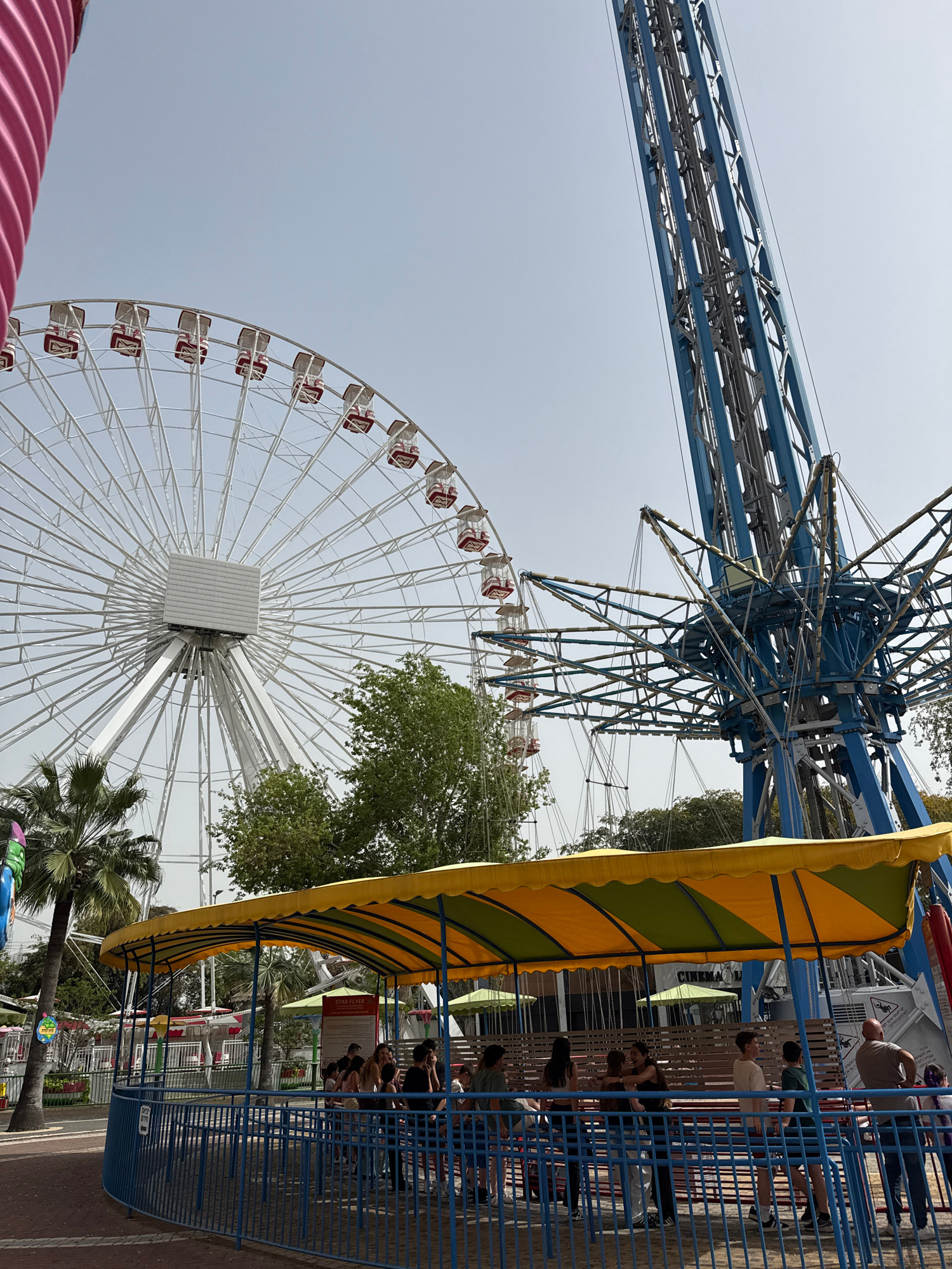 The image shows a view of an amusement park in Tel Aviv, Occupied Palestine, featuring a Ferris wheel, a swing carousel, and a tower ride. The Ferris wheel is white with red accents on the passenger c…read more