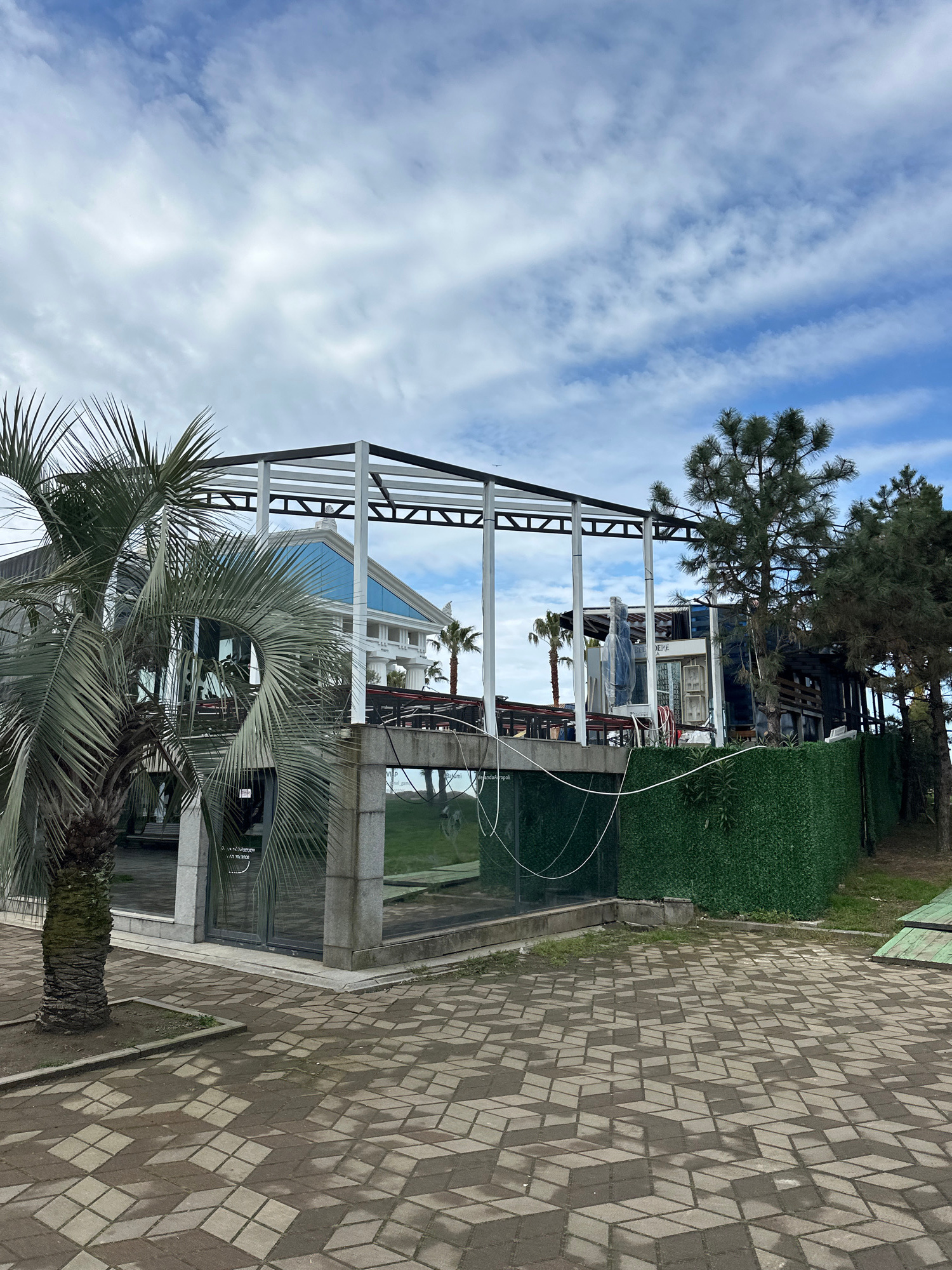 The image shows an outdoor scene in Batumi, Georgia, featuring a partially constructed building with a black and white steel frame. Palm trees are present in the foreground and middle ground. The sky…read more