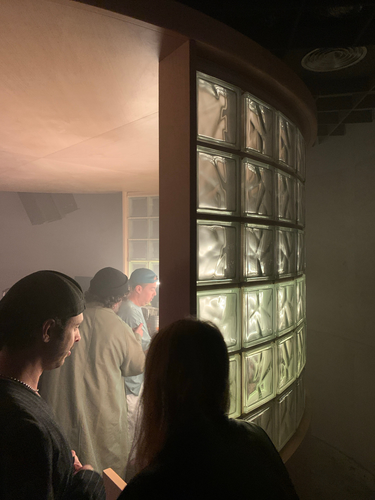 A view through a series of glass blocks shows an interior scene with three people on what appears to be a bed, which reflects the layout of the glass block grid. The angle gives the impression that thβ¦read more