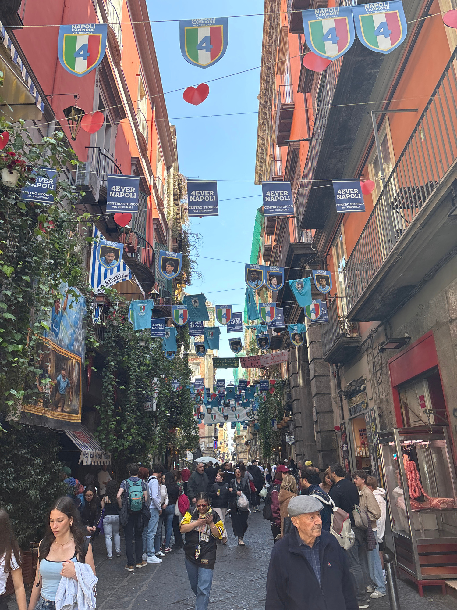 The image captures a bustling street scene in Naples, Italy, adorned with decorations. Overhead, numerous banners and pendants bearing the "4EVER NAPOLI" inscription and images of Napoli soccer player…read more