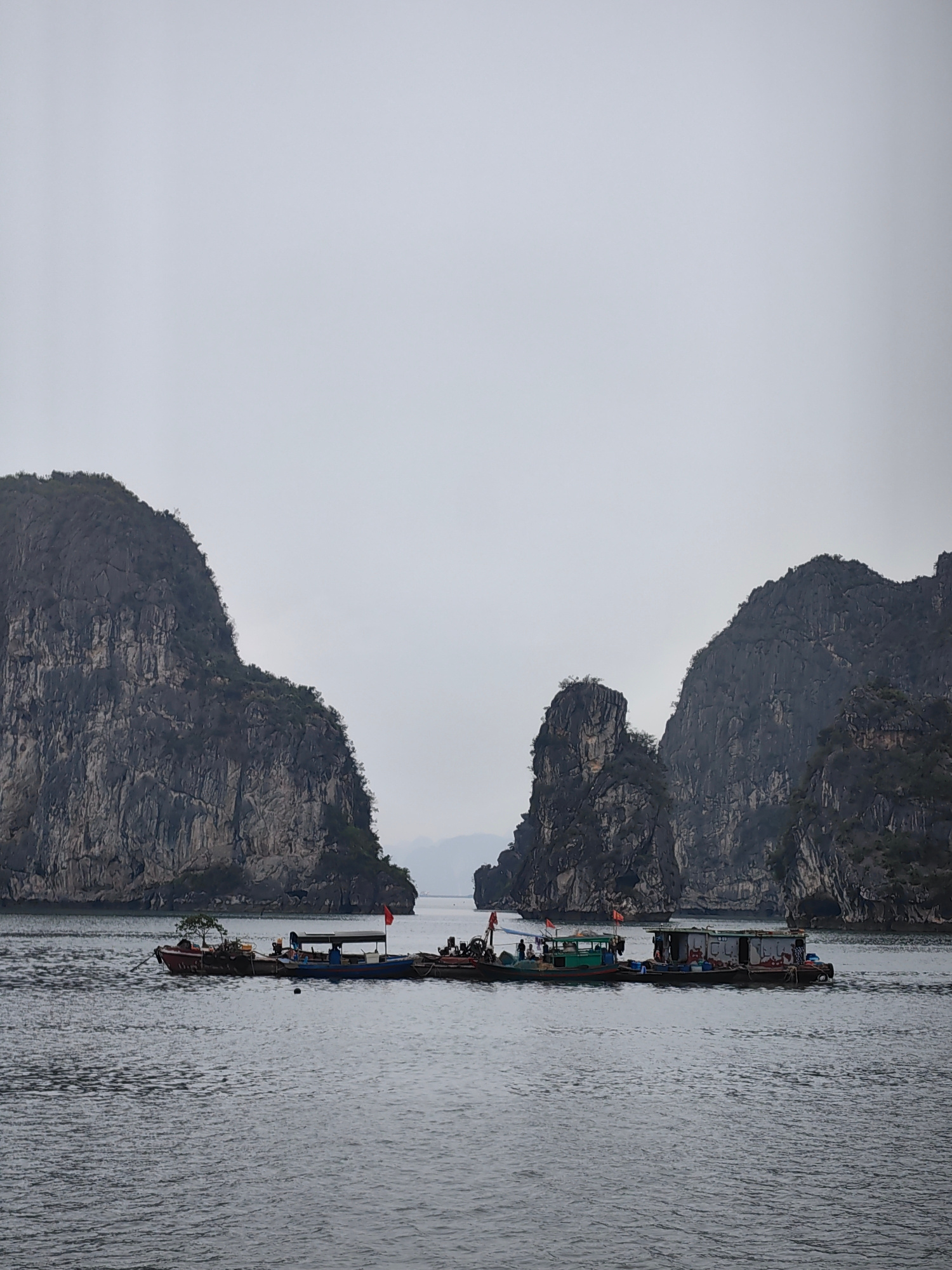 The image captures a view of Ha Long Bay, Vietnam, characterized by its distinctive limestone karsts rising from the water. In the foreground, a long, multi-sectional boat occupies the center of the f…read more