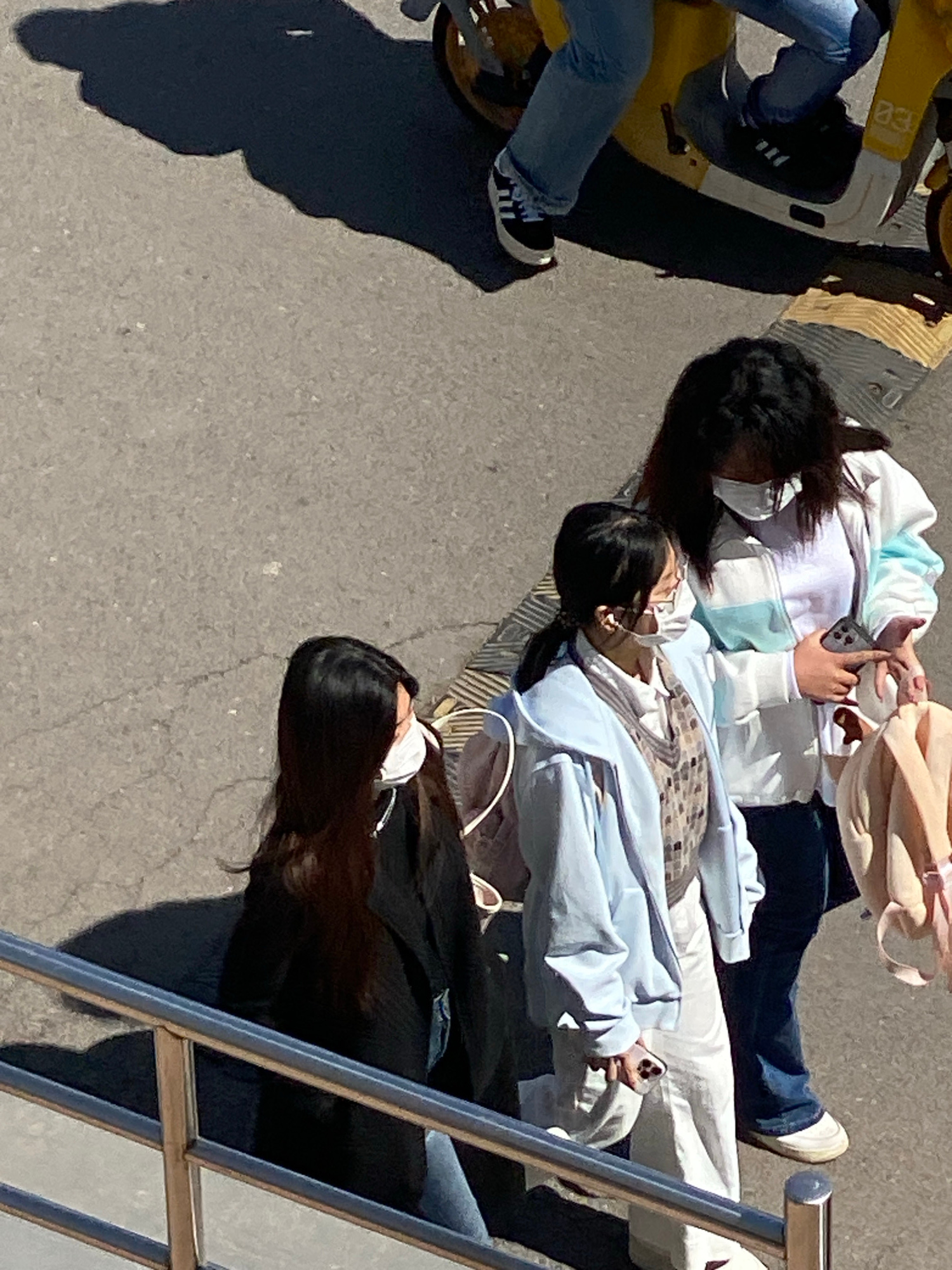 The image, captured from an elevated perspective, shows three young women standing on a gray concrete surface. All three women are wearing face masks. One woman, wearing a white and light blue hoodie,…read more