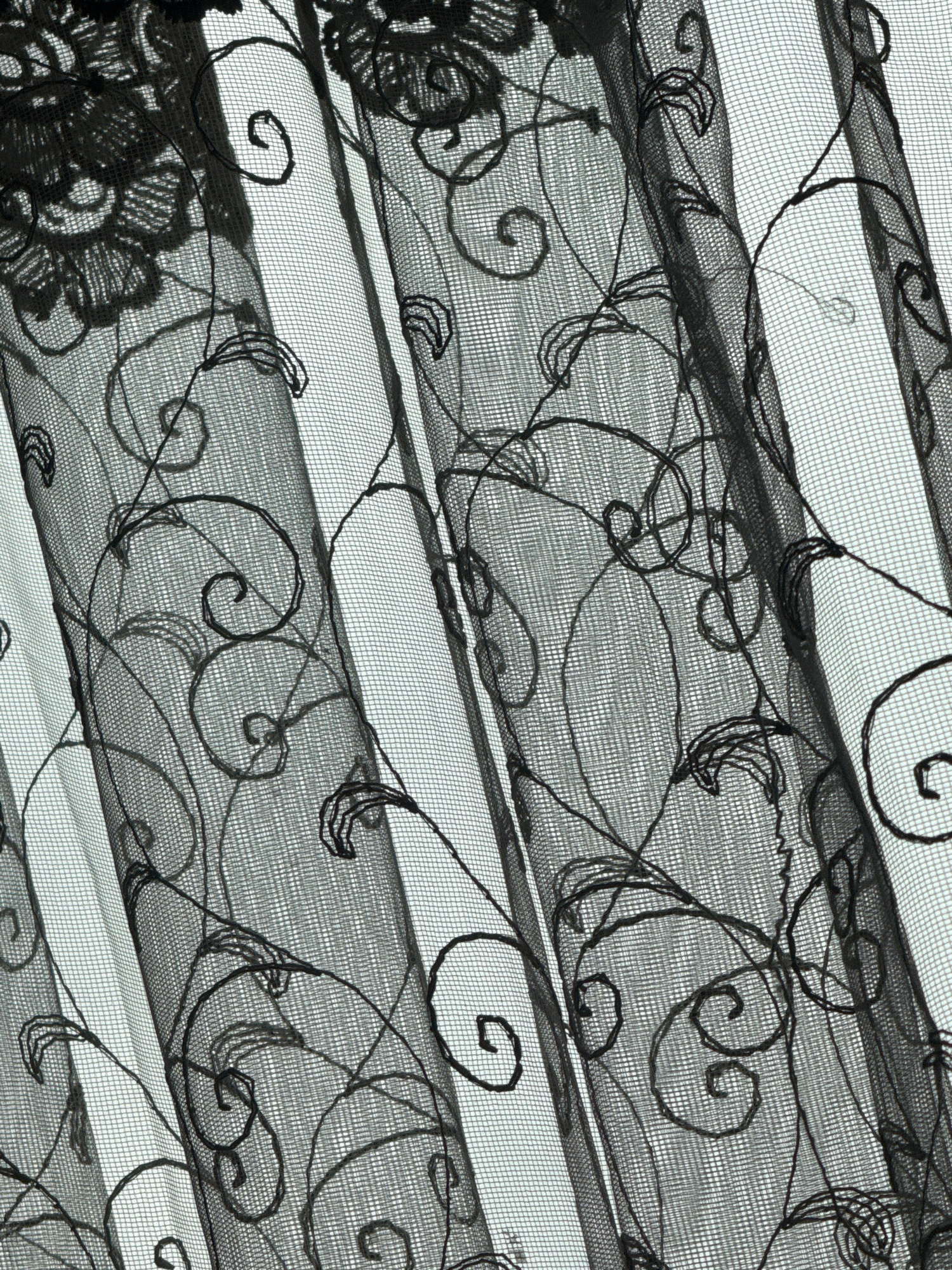 The image shows a close-up of a semi-transparent black fabric with an embroidered floral and scrollwork pattern. The fabric is folded or draped, creating alternating light and dark horizontal bands. T…read more