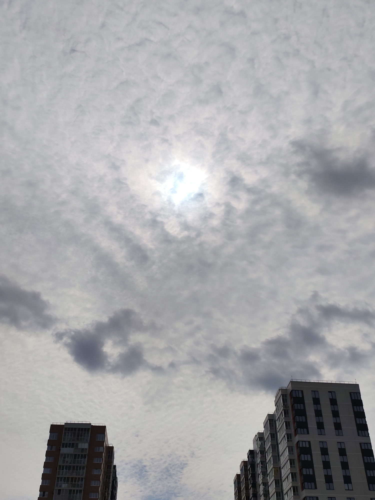 The image shows a view of the sky and the tops of two apartment buildings in Izhevsk, Russia. The sky is mostly covered with Altocumulus clouds, with the sun visible as a bright spot behind the clouds…read more