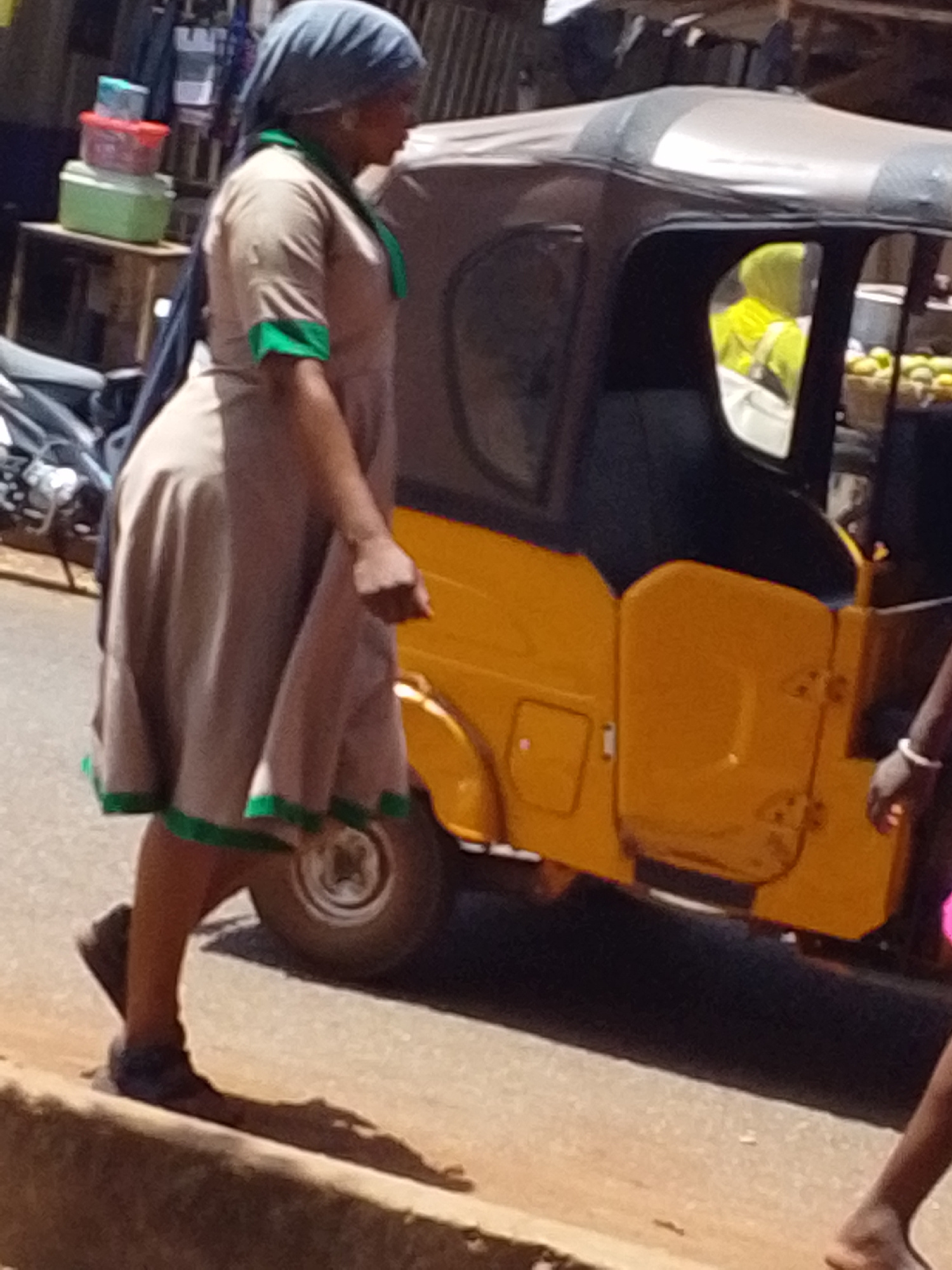 A woman wearing a dress and headscarf walks alongside a yellow-and-black auto rickshaw on a street. The woman's dress is tan with green trim. A person wearing a yellow jacket sits inside the auto rickβ¦read more