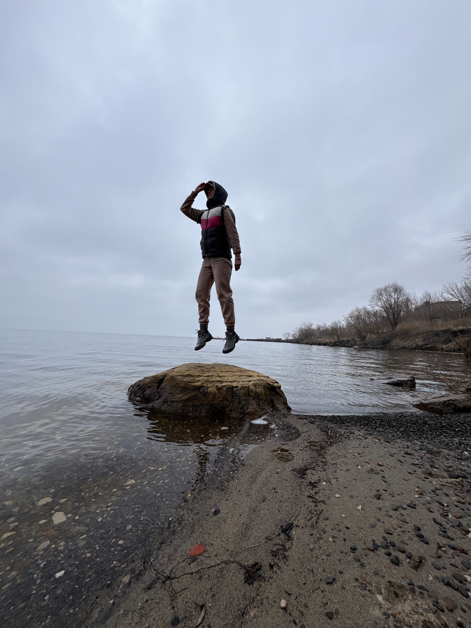 The image depicts a person standing on a rock in a body of water, likely the Volga River, in Ulyanovsk, Russia. The person is wearing a hooded jacket, light-colored pants, and dark shoes. They are fac…read more