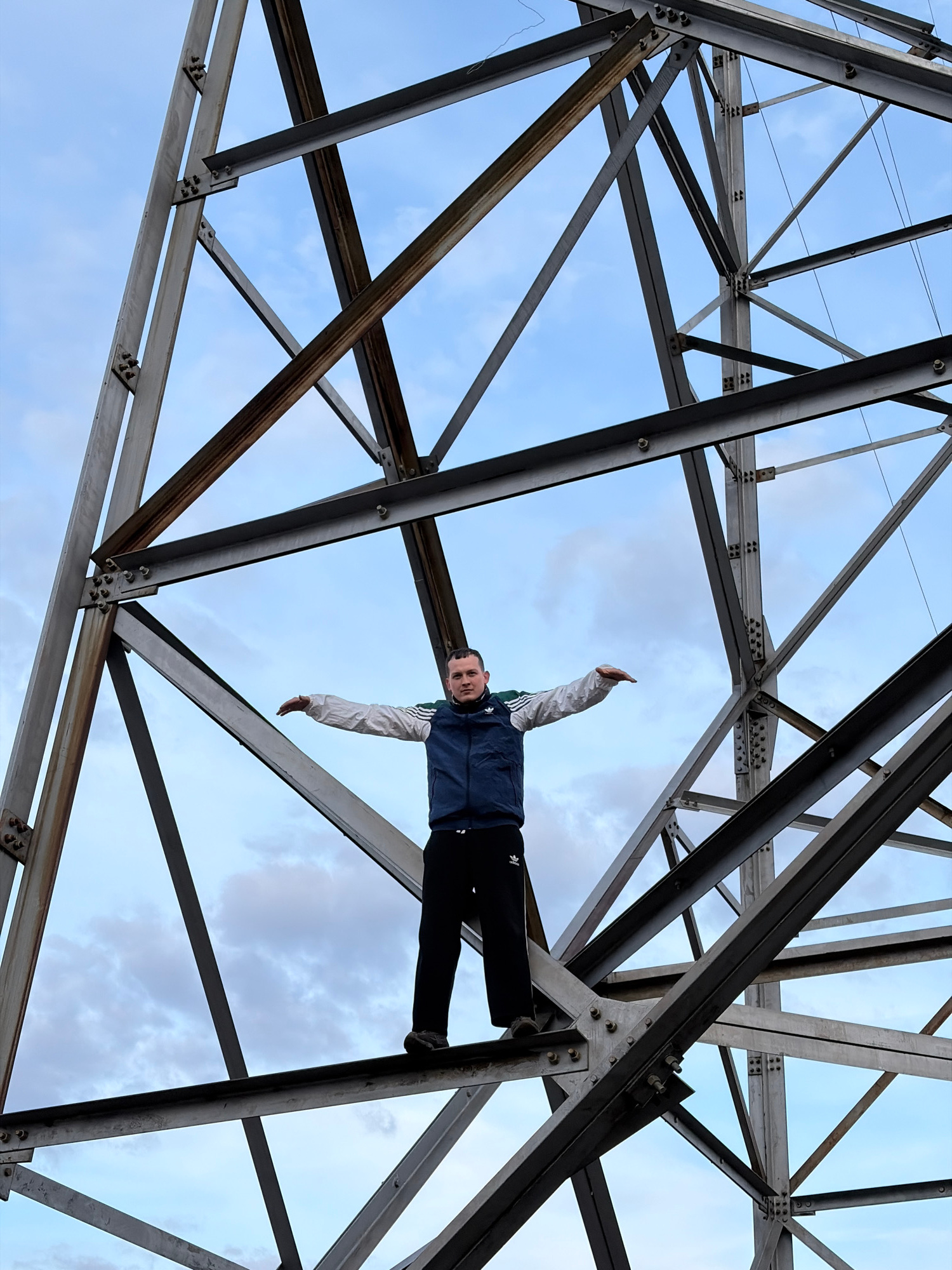 The image depicts a person positioned on the framework of an electricity pylon against a backdrop of sky. The pylon's structure is composed of intersecting steel beams, arranged in a lattice-like patt…read more