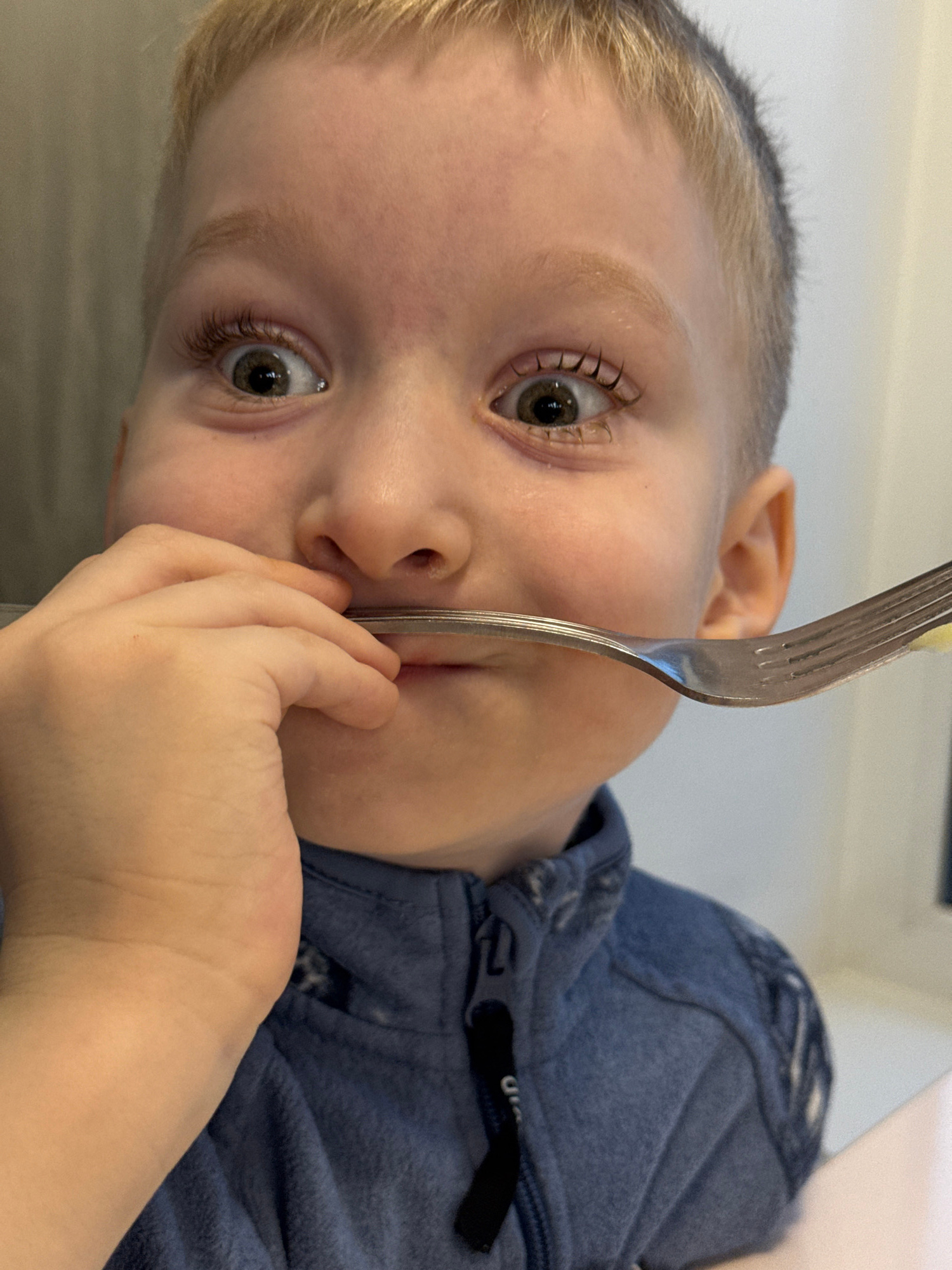 A young child with blond hair and fair skin is holding a silver fork to their face, obscuring the nose and mouth. The child has wide, light brown eyes with long eyelashes. The child is wearing a blue…read more