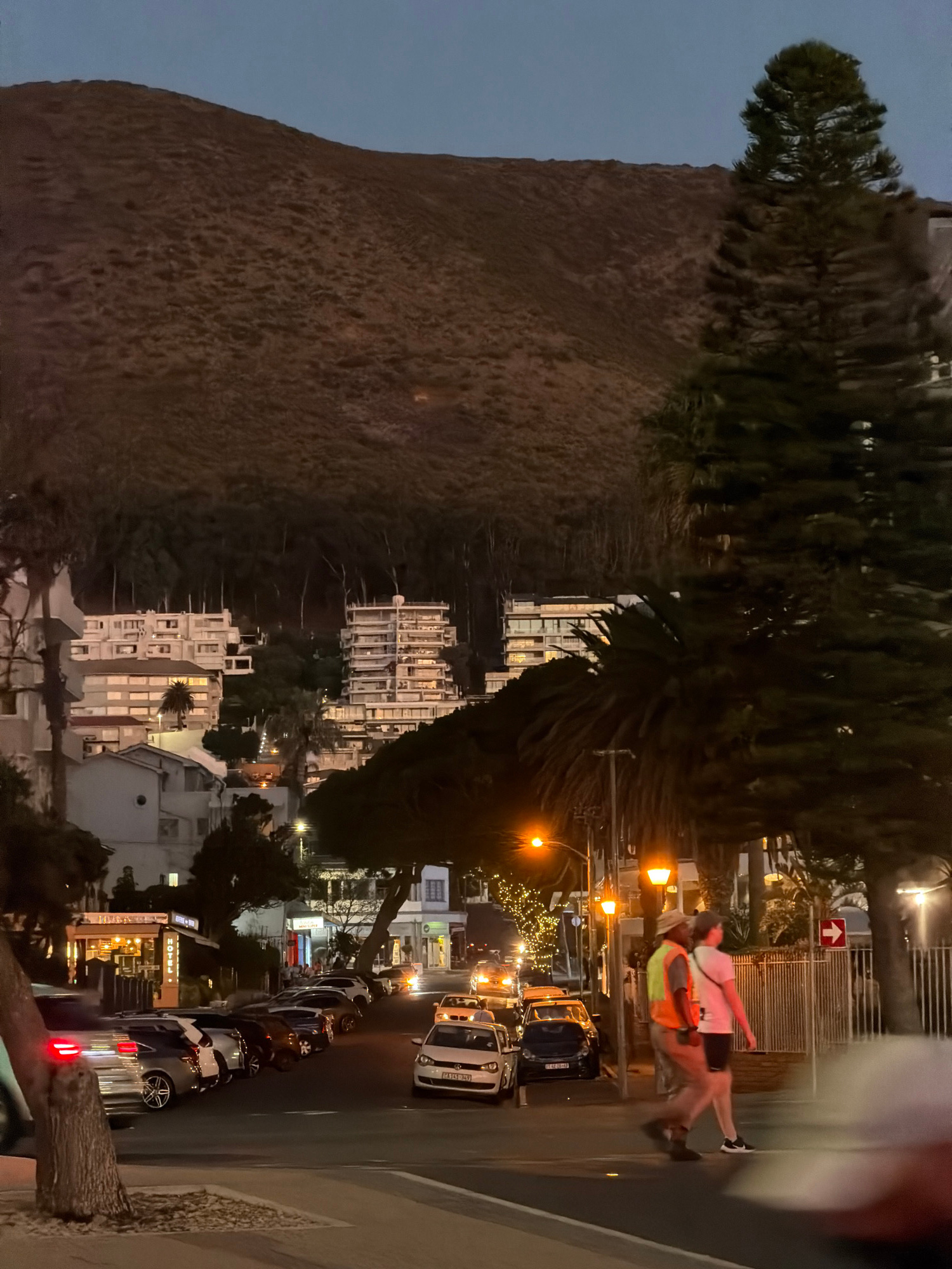 The image shows a street scene in Cape Town, South Africa at dusk. A large mountain dominates the left side of the frame. Buildings are seen in the background. A street runs along the right side of th…read more