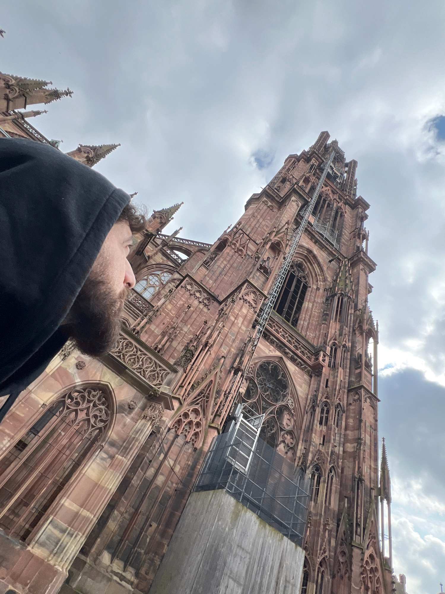 A low-angle shot of a person looking up at the Strasbourg Cathedral in Strasbourg, France. The person, wearing a black hoodie, is positioned in the lower part of the frame. The cathedral, a tall struc…read more