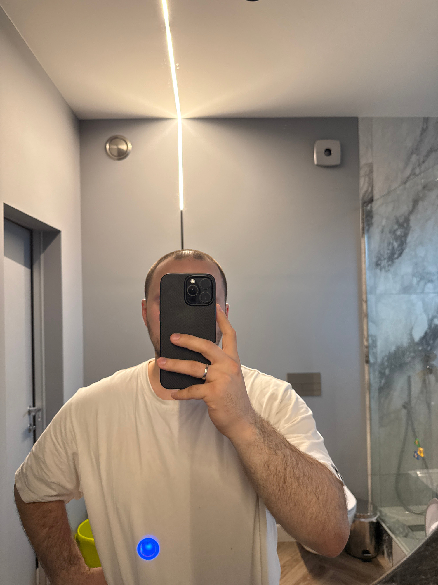 A person stands in a bathroom taking a selfie in the mirror. The bathroom has a white marble shower, gray walls, a vanity, and a linear LED light. The person is wearing a white T-shirt and holding a d…read more