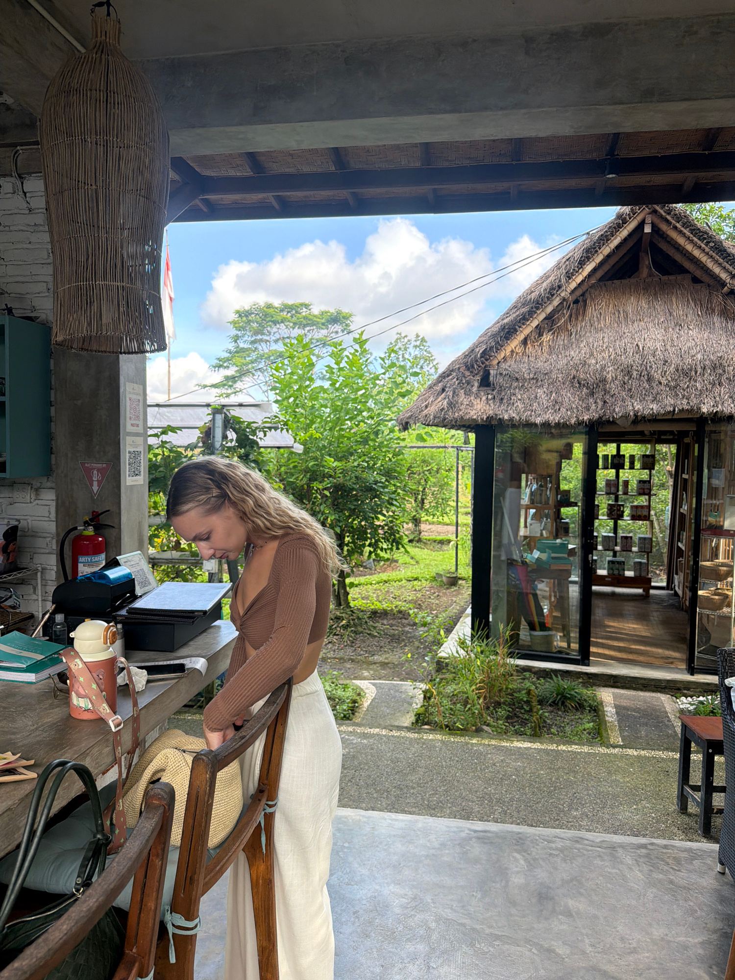 The scene is captured in Ubud, Indonesia. A fair-skinned woman with blonde hair is bent over at a table, facing downwards. She wears a brown, long-sleeved shirt, and light-colored pants, seemingly foc…read more