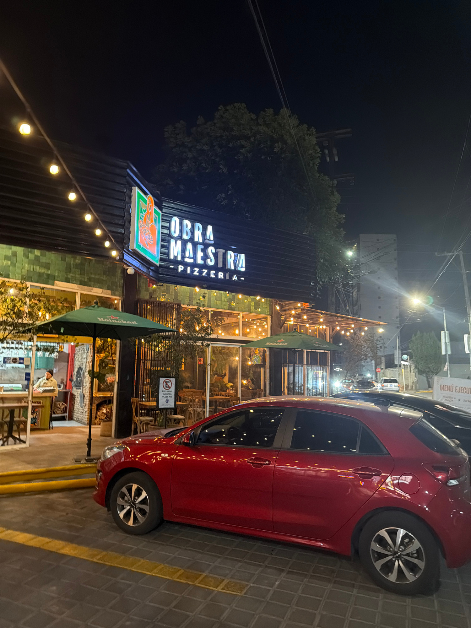 The image shows the exterior of "Obra Maestra Pizzeria" in Cholula, Mexico, at night. The pizzeria's illuminated sign is prominently displayed above a corrugated metal structure decorated with string…read more