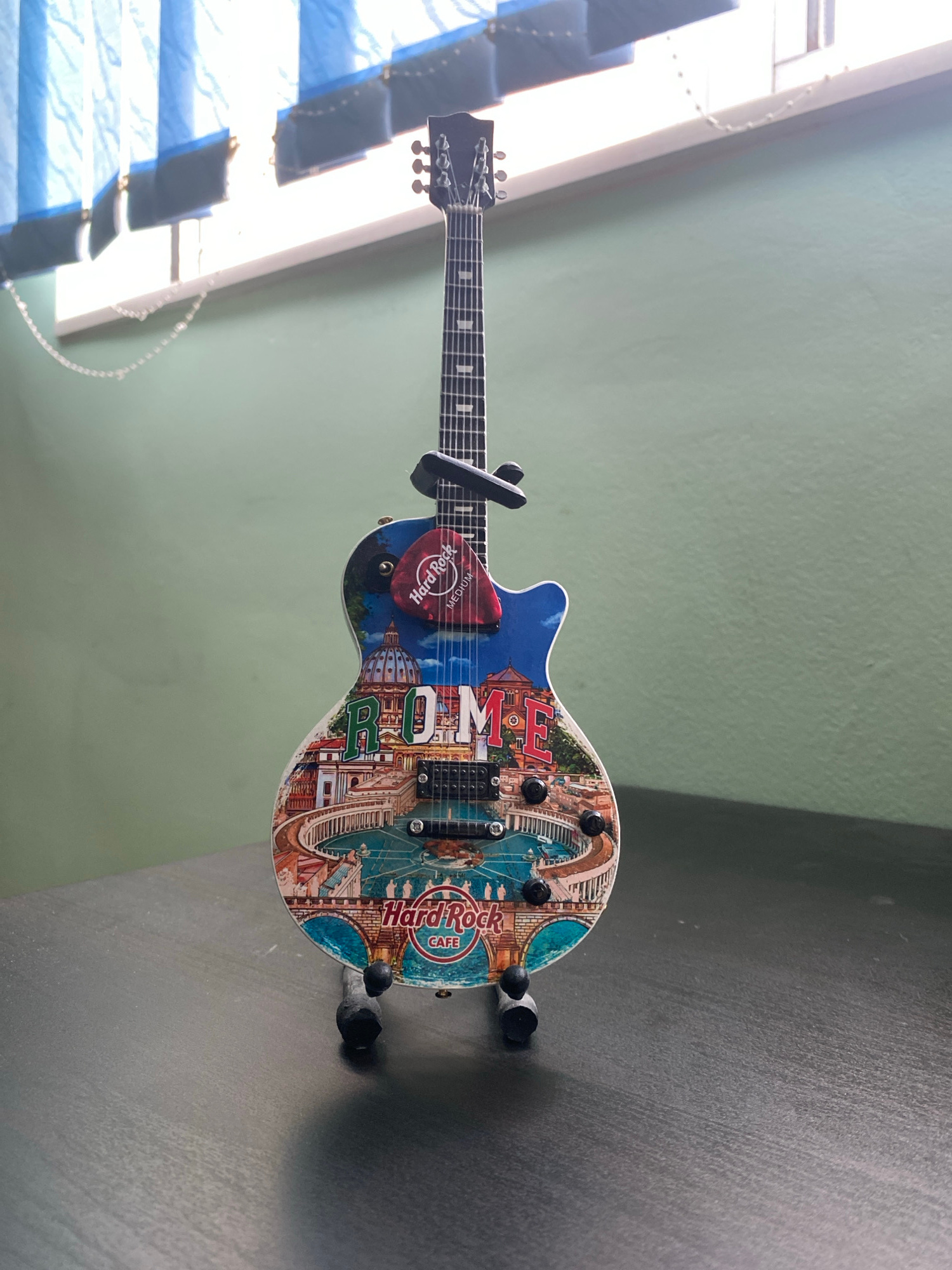 The image shows a miniature electric guitar, likely a decorative item, standing vertically on a black surface against a green wall. The guitar's body is decorated with a collage of images related to R…read more