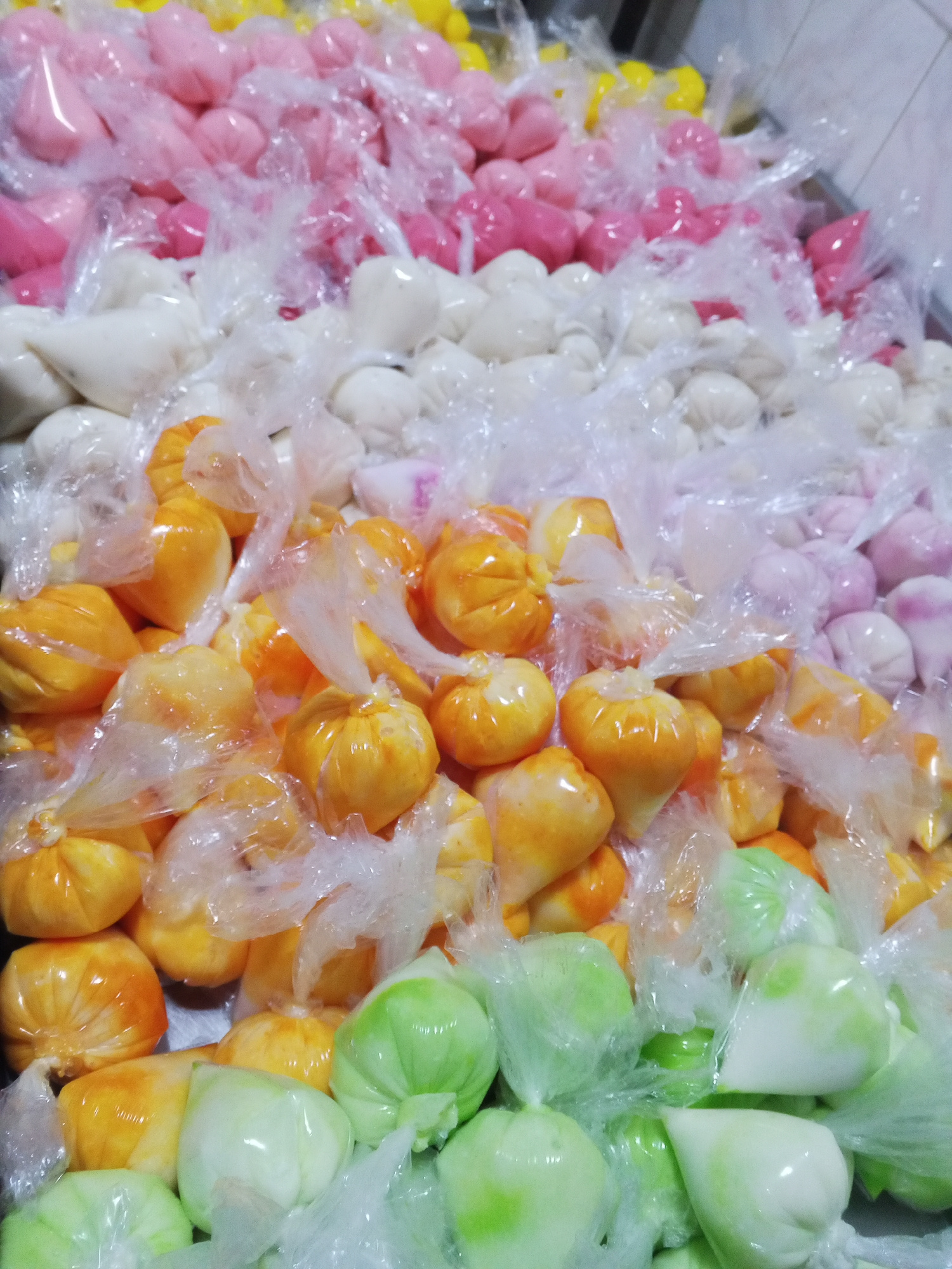The image shows a close-up of multiple small plastic bags filled with liquids of various colors arranged in rows. The colors include yellow, pink, white, orange, lavender and green. The bags are likel…read more