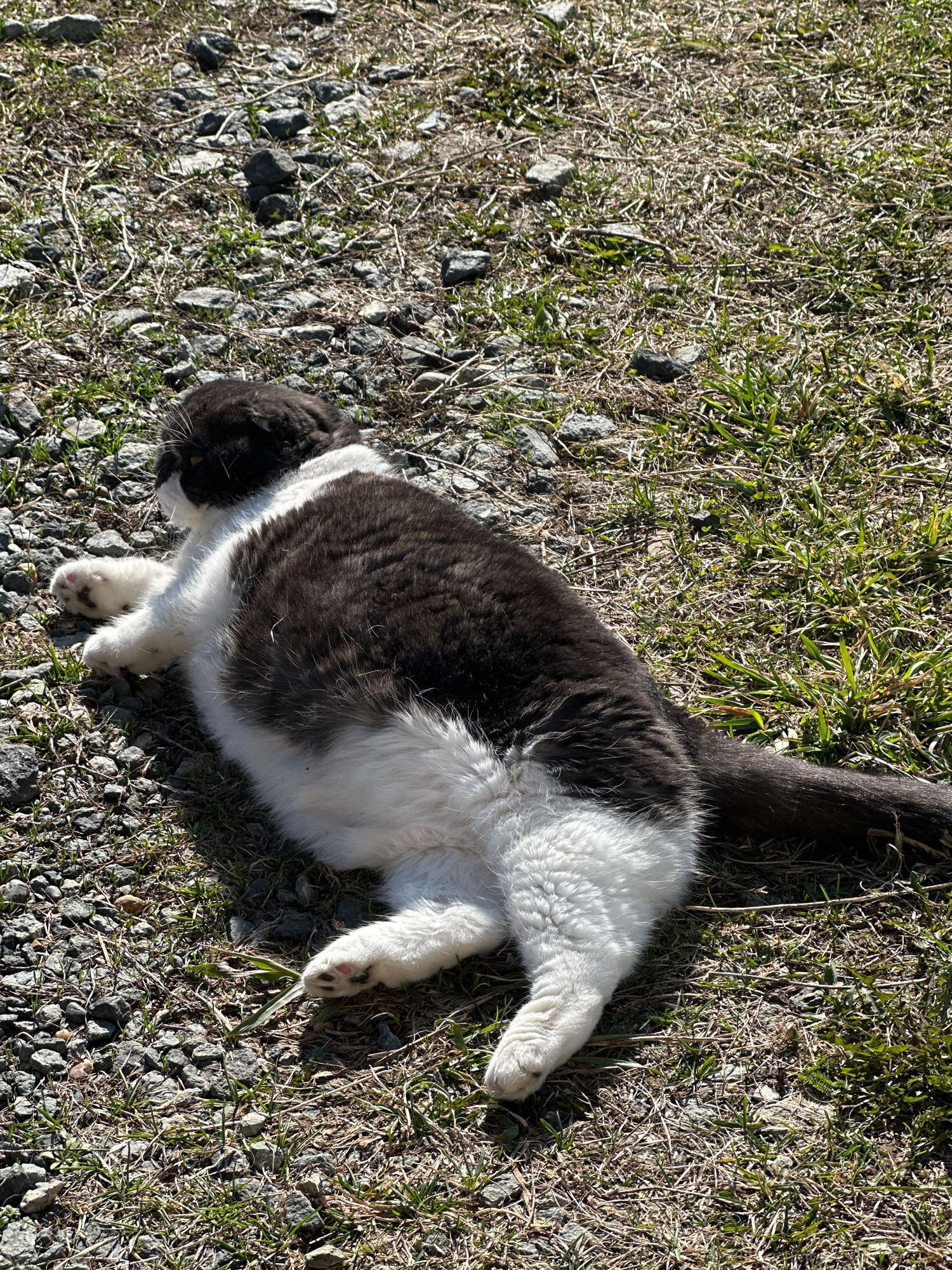 A black and white cat is depicted lying on its back, stretched out comfortably on the ground, exposing its white belly. The cat has a fluffy coat, with dark grey or black fur on its back and head, and…read more