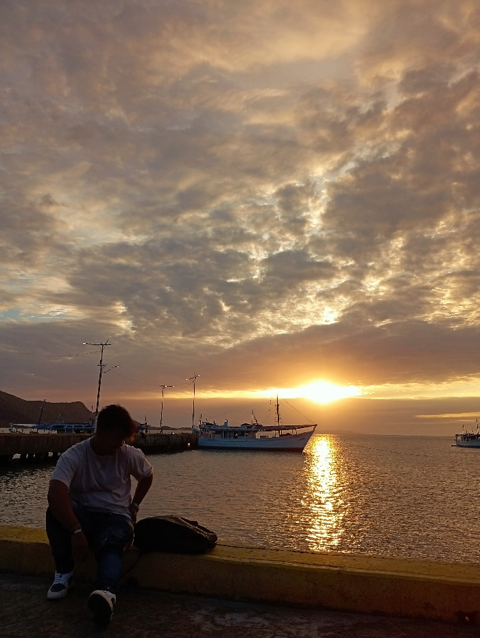 The image captures a sunset or sunrise over the harbor in Juan Griego, Venezuela. A male individual is seated in the foreground on a concrete pier, specifically on a yellow-painted curb or safety barr…read more