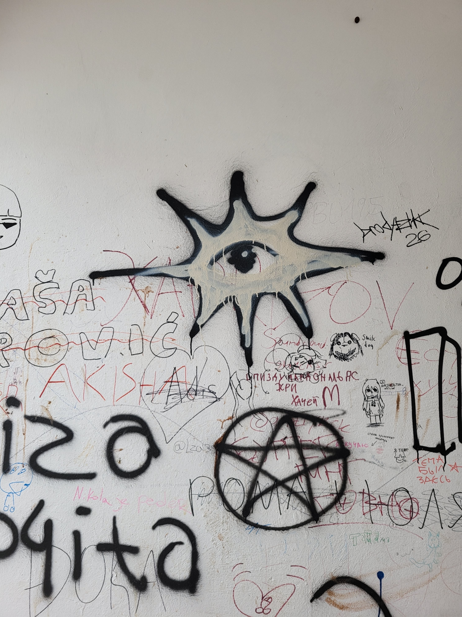 The image captures a section of a wall covered in graffiti, possibly located in an urban area of Budva, Montenegro. The wall's surface is a light color, and the graffiti includes various drawings, sym…read more