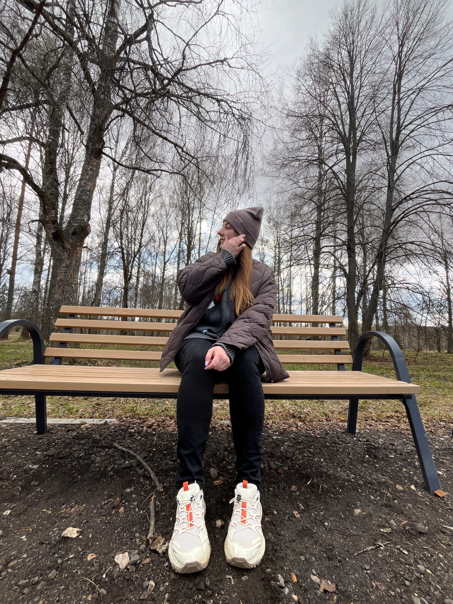 A woman in a brown hat and jacket sits on a wooden bench in a park. She is wearing black pants and white sneakers with orange accents. The ground around the bench is dirt and pebbles. Bare trees fill…read more