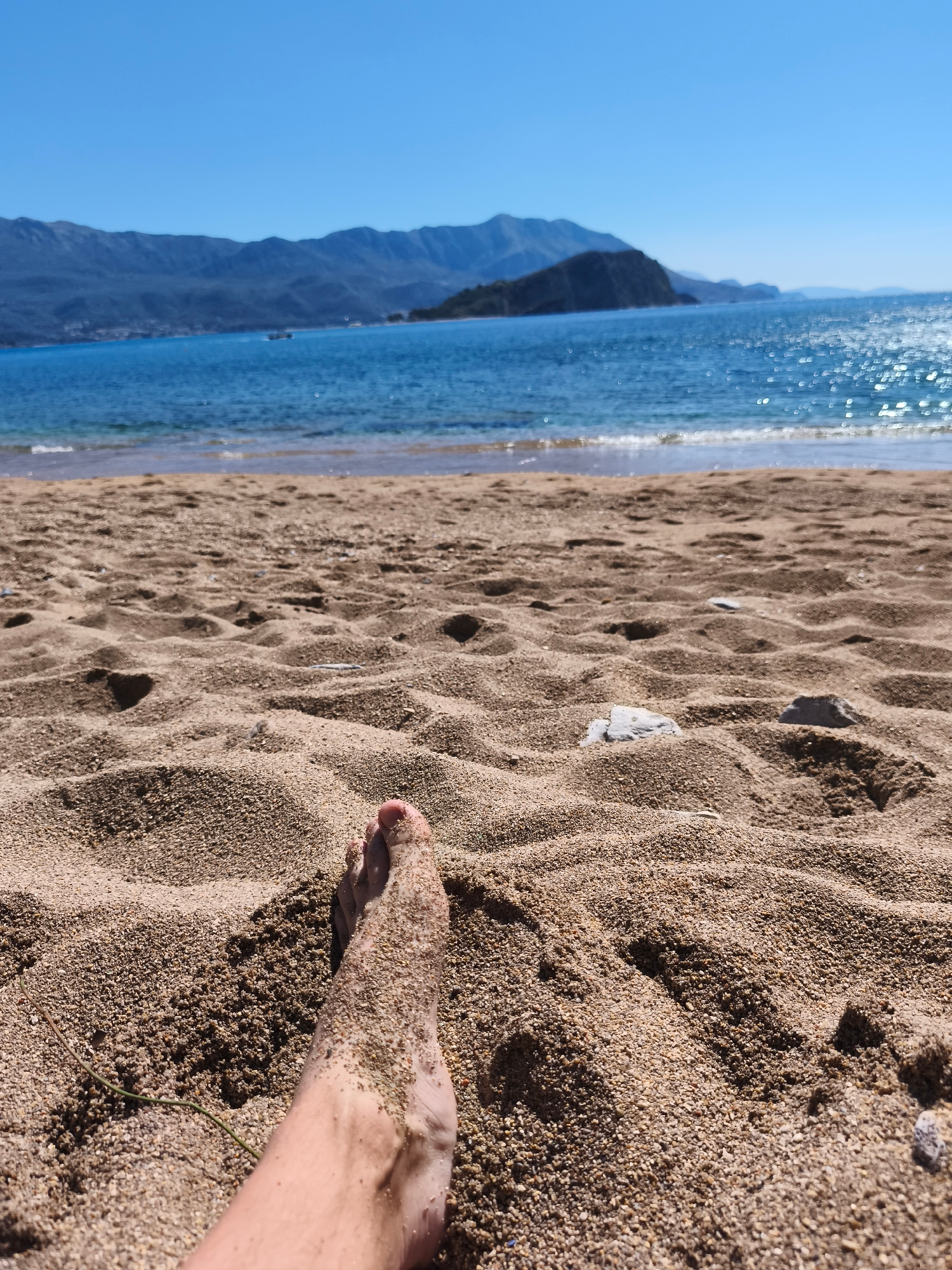 A sandy beach in Budva, Montenegro under a clear blue sky. A single, sandy foot rests in the foreground, partially obscuring the view. The sand is light brown, grainy, and unevenly distributed, with s…read more