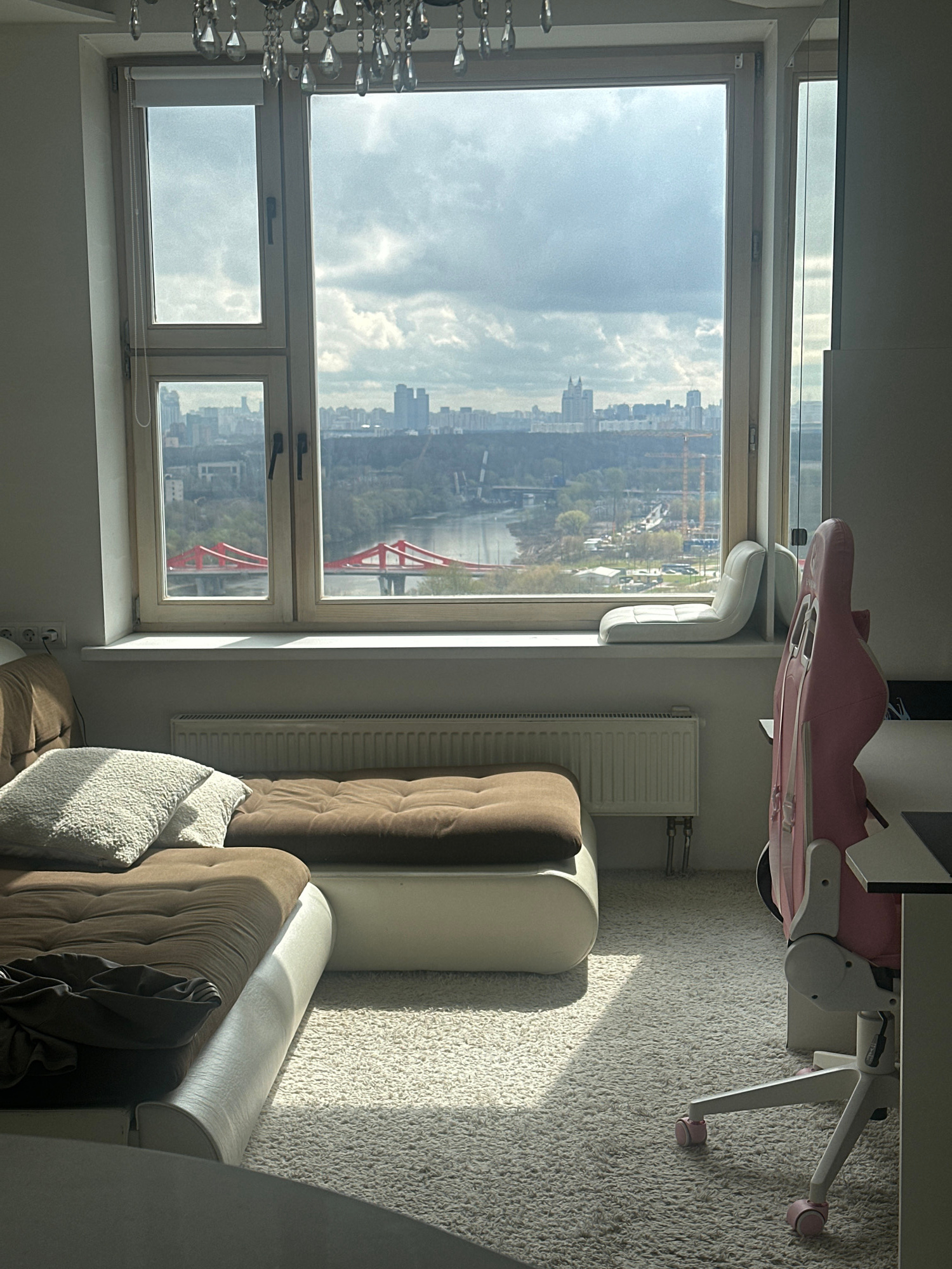 The image shows a bright indoor room with a large window offering a panoramic view of an urban landscape. The room features a light-colored, shaggy carpet covering the floor. Sunlight streams through…read more