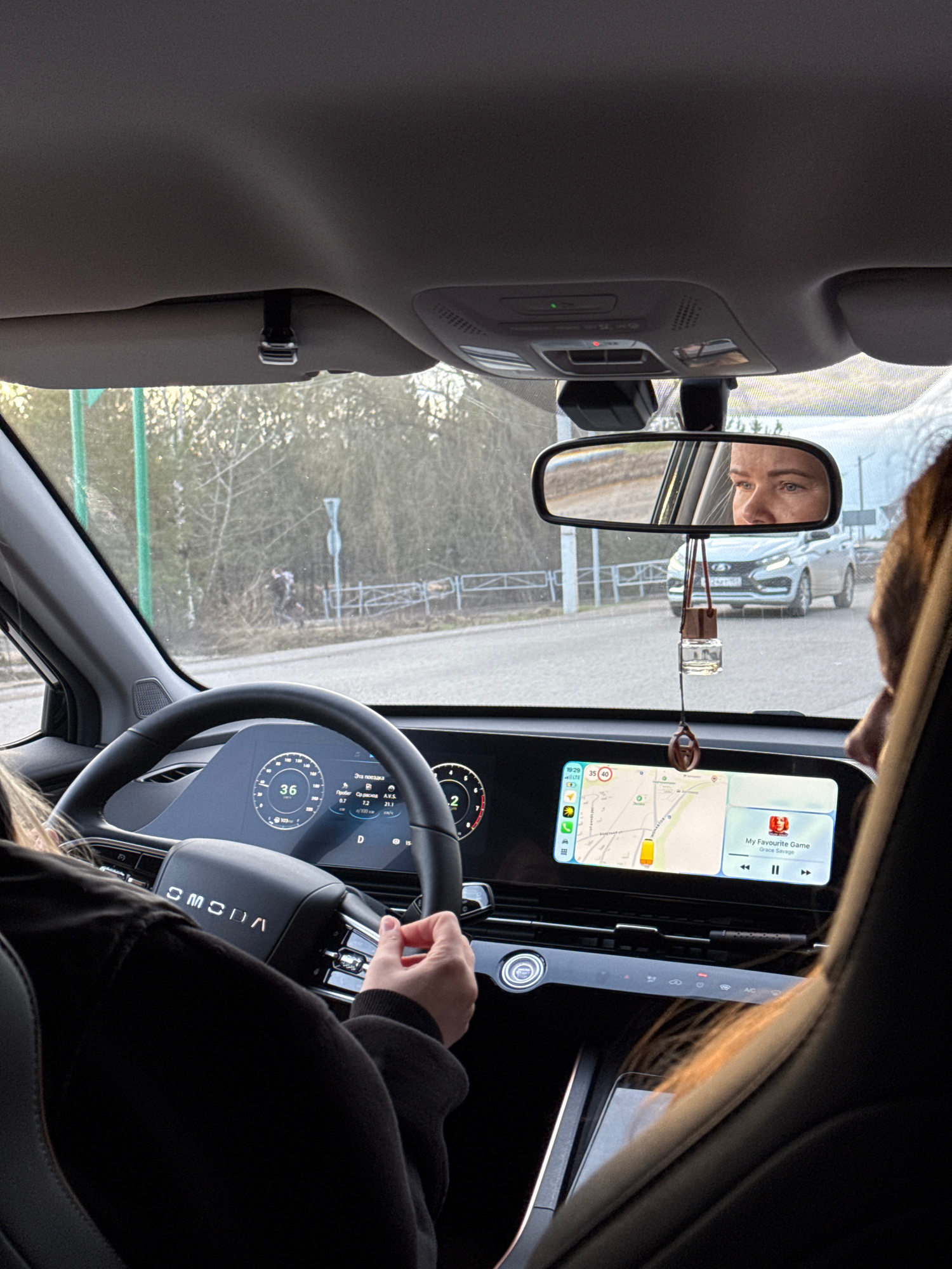 The image shows the interior of a car, with the driver visible in the rearview mirror. The infotainment screen displays a map and music information. The car's dashboard and steering wheel are also vis…read more